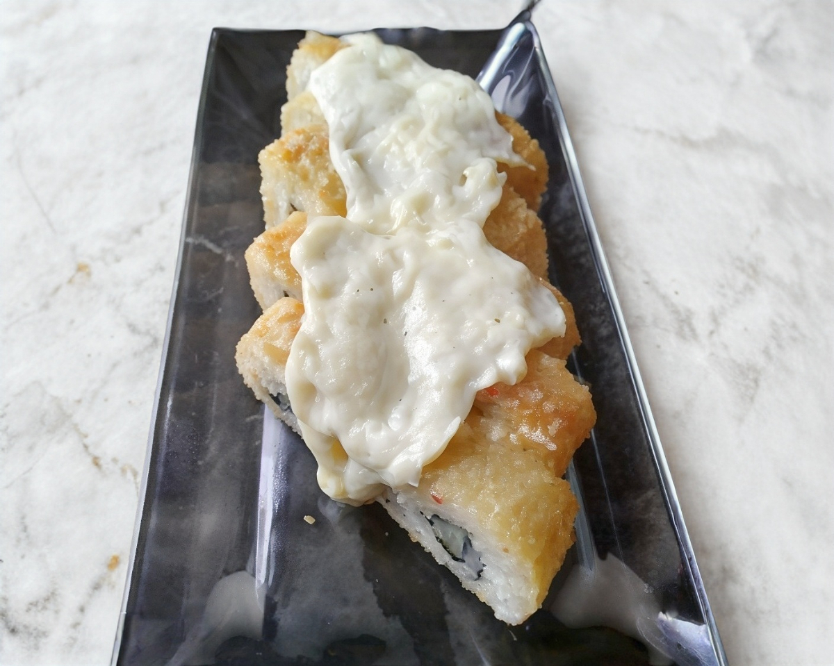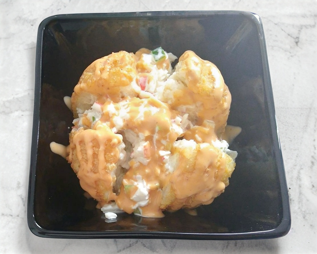 BOLA DE ARROZ RELLENA DE AGUACATE Y QUESO PHILADELPHIA CUBIERTA DE TOPPING TAMPICO Y ADEREZO CHIPOTLE