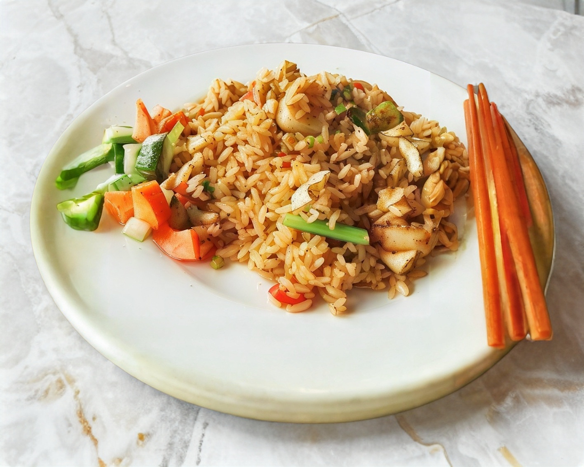 Porción personal: ARROZ FRITO CON VERDURAS CON CAMARON RES POLLO SALTEADAS.