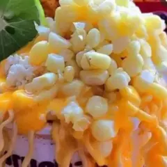 Elote preparado con mayonesa queso sierra una guarnición de Sabritas a elegir una porción de chaska mayonesa queso sierra queso amarillo derretido mantequilla y chile preparado con limon