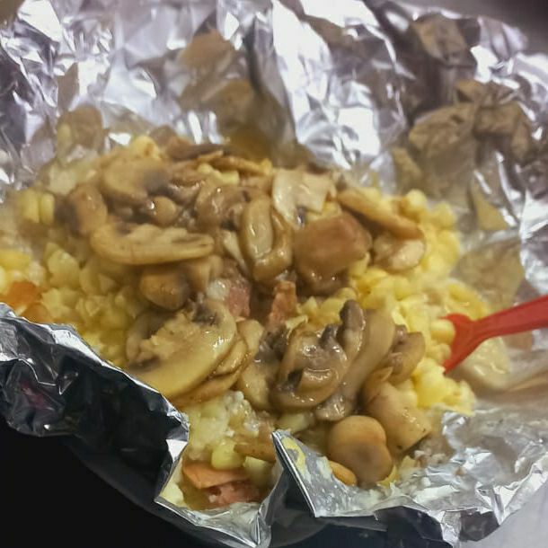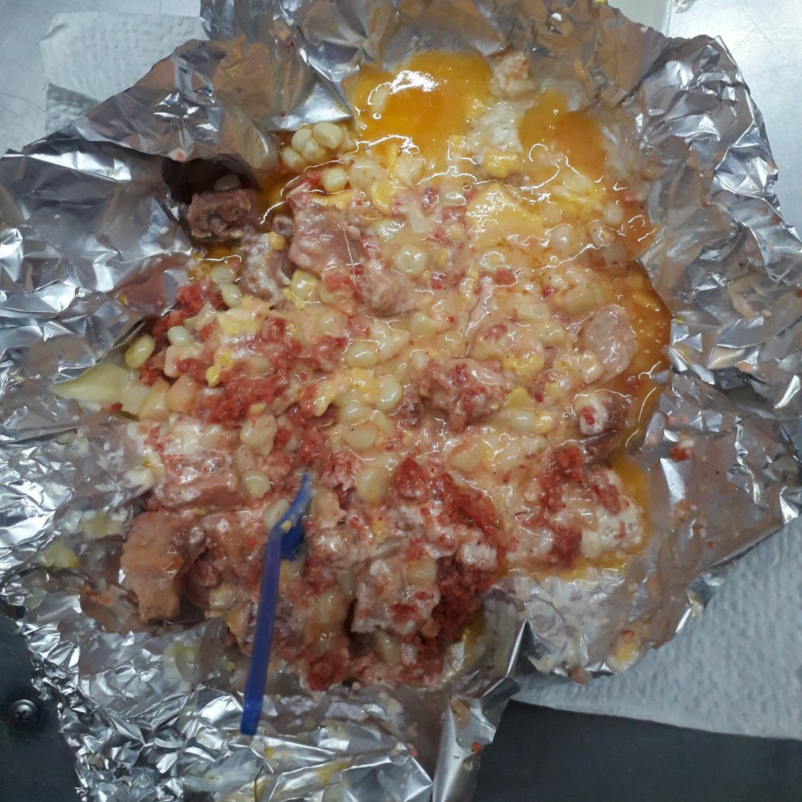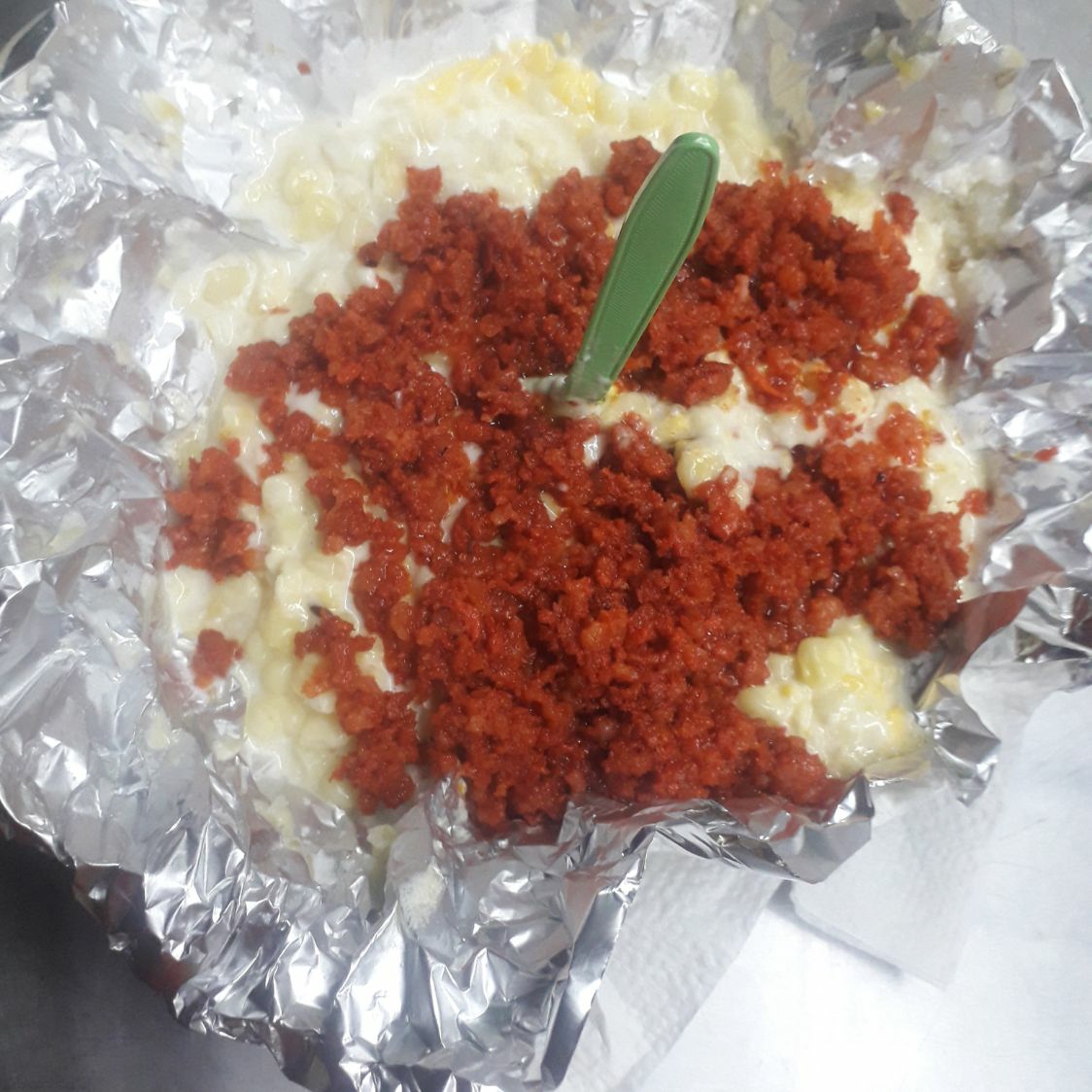 Chaska cocida o asada preparada con mayonesa mantequilla queso sierra tocino chorizo kso americano manchego y asadero envuelto en papel aluminio y cocinada al carbón