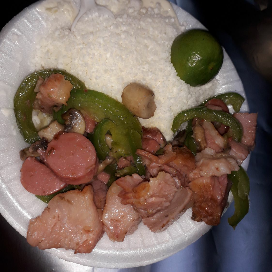Plato redondo con chaska cocida o asada preparada con mayonesa o aderezo bañada con queso sierra y acompañado con trocitos de tocino salchicha y Chile Chile morrón