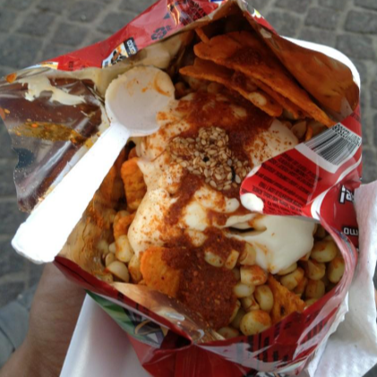 Elote desgranado hervido acompañado con doritos, preparada con mayonesa o aderezo bañada con queso sierra. Acompañado de chilito liquido y limón.