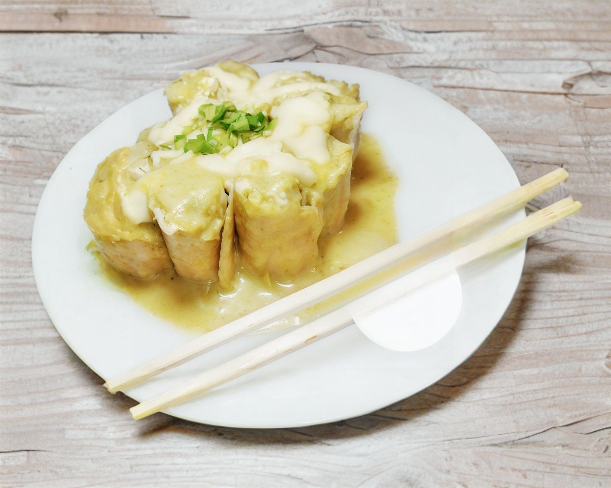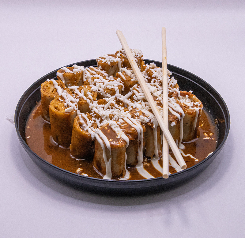Deliciosas sushiladas, bañada de nuestro mole dulce, rellenas de pechuga de pollo desmenuzada, acompañada de cebolla morada curtida con limón. Incluyen queso fresco rallado, crema y palillos para sushi.