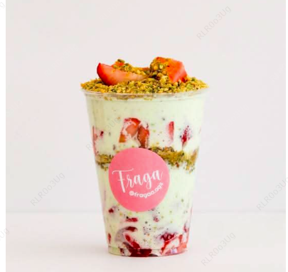 Crema de pistache, trocitos de pistache más fresas frescas.