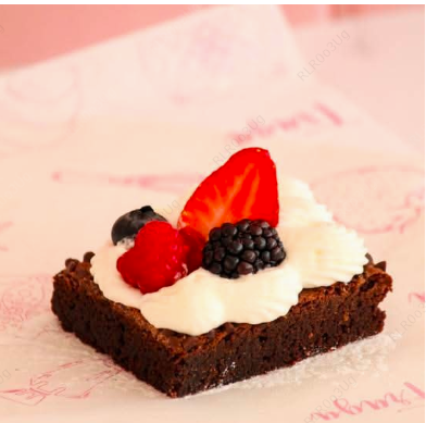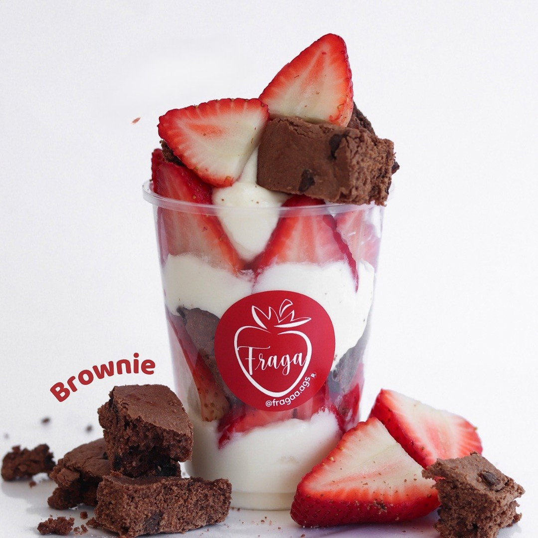 Crema especial, fresas frescas y trocitos de brownie.
