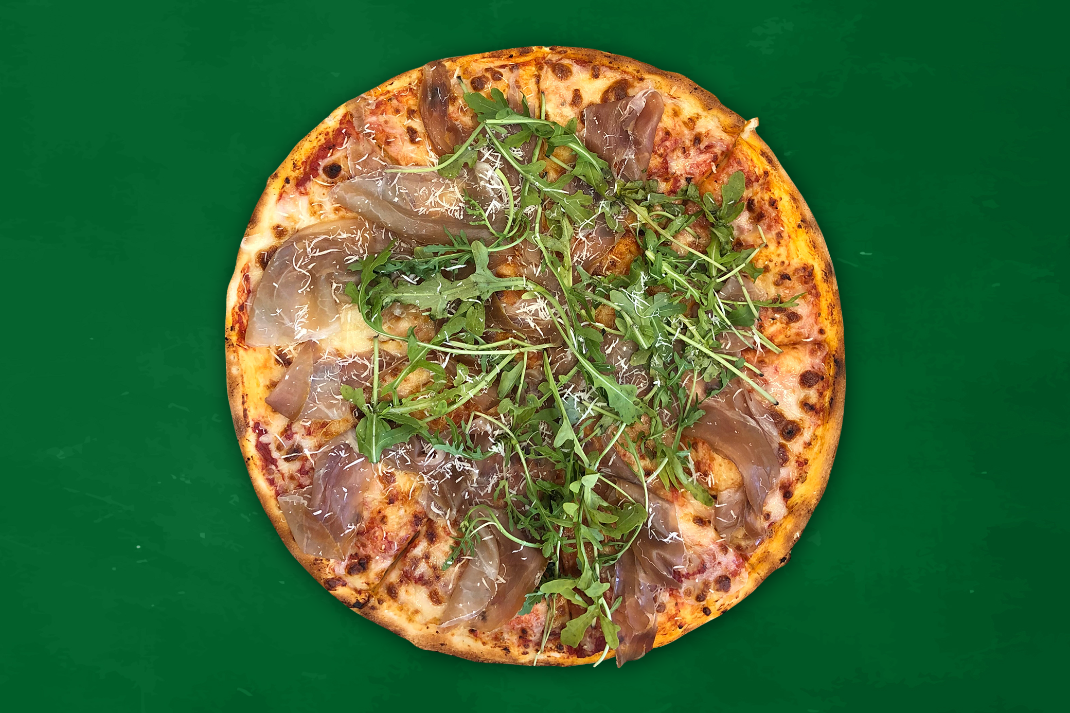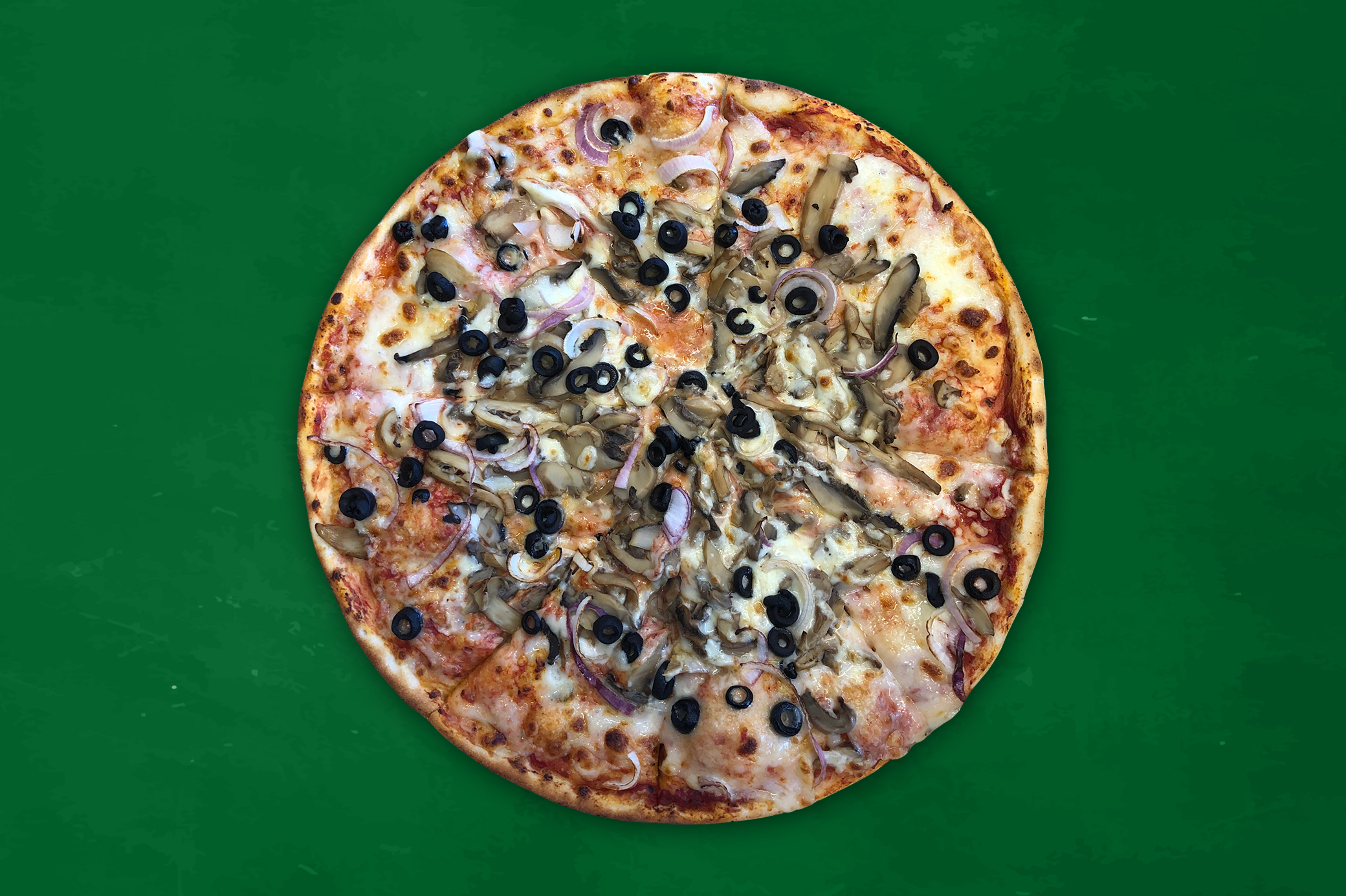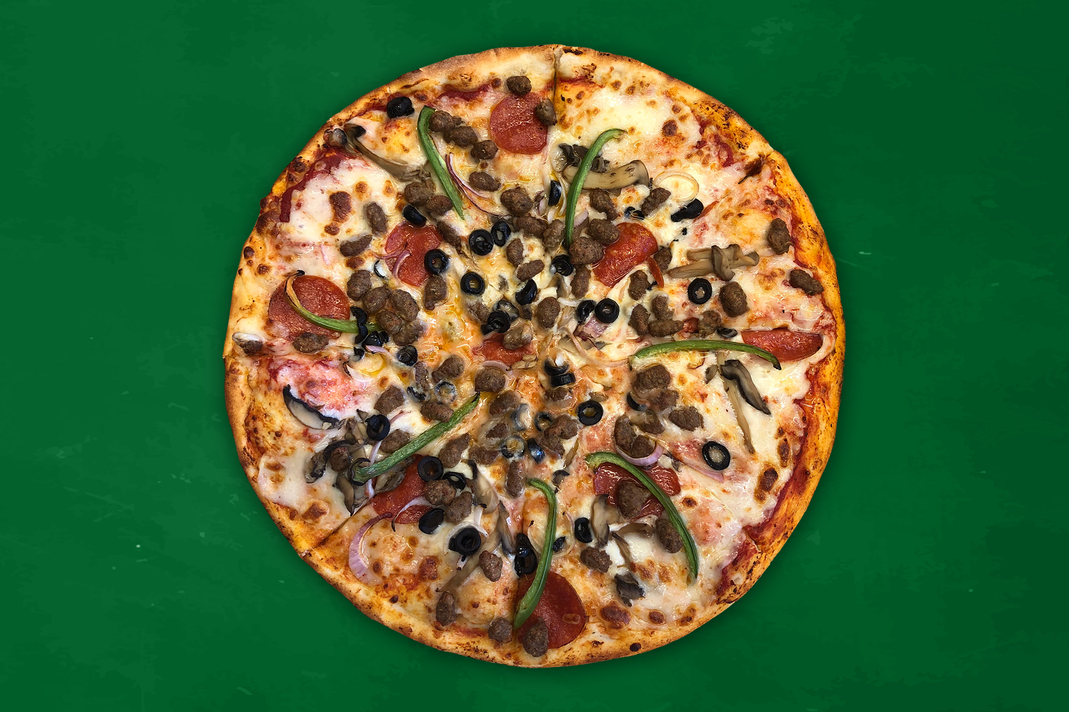 Salchicha italiana, pepperoni, cebolla, pimiento, aceituna y parmesano.