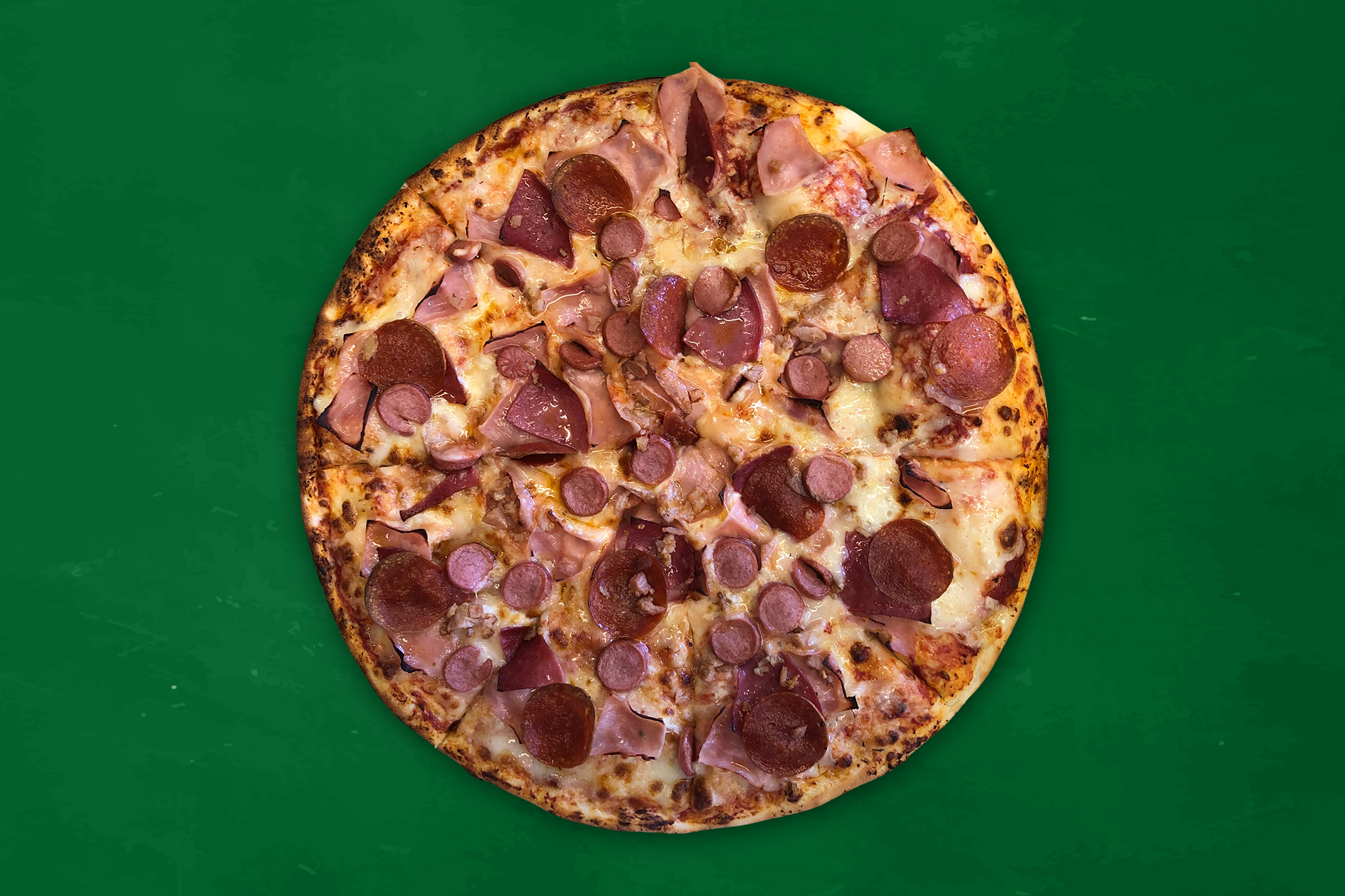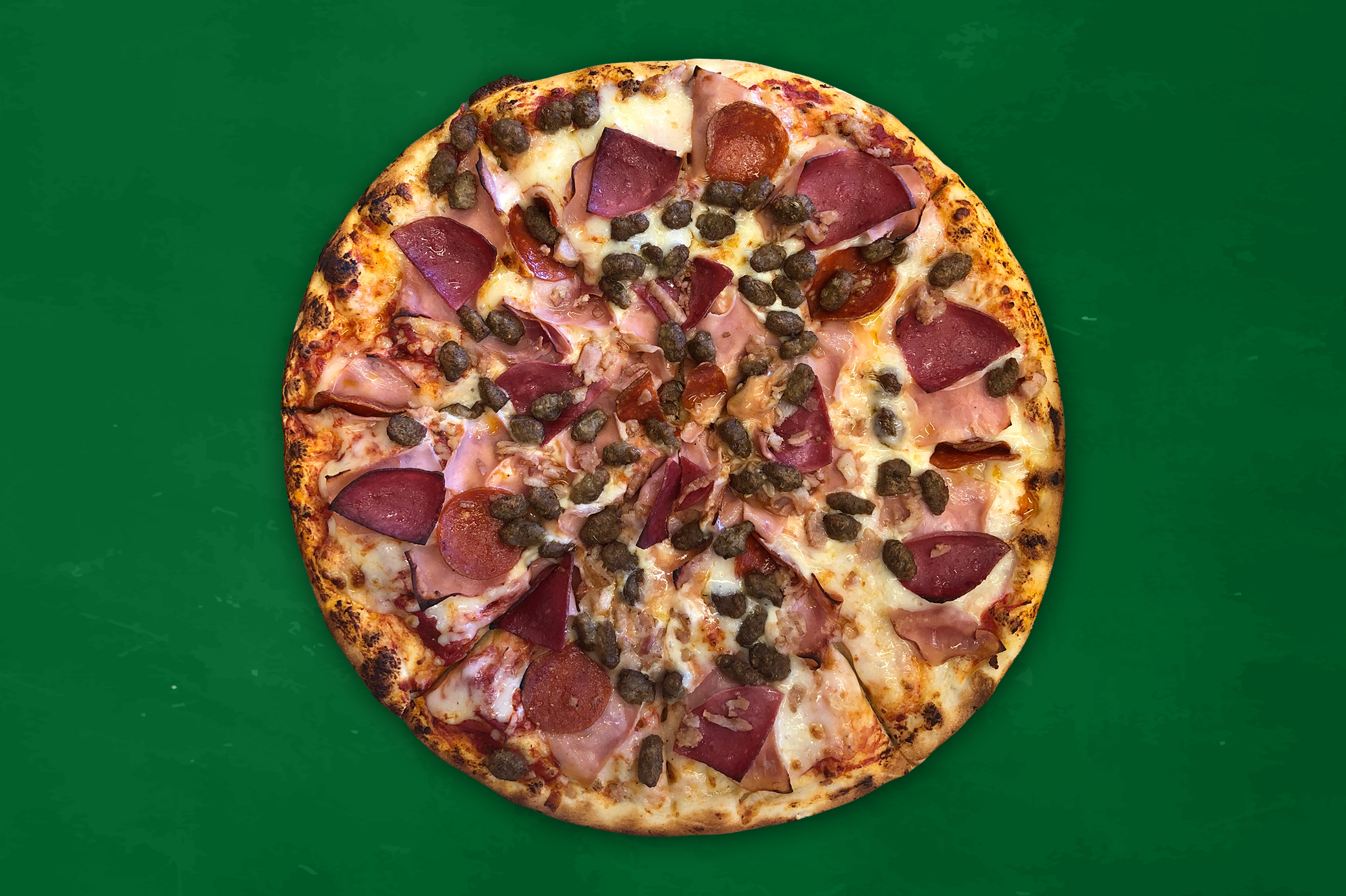 Salchicha italiana, pepperoni, jamón, salami y tocino.