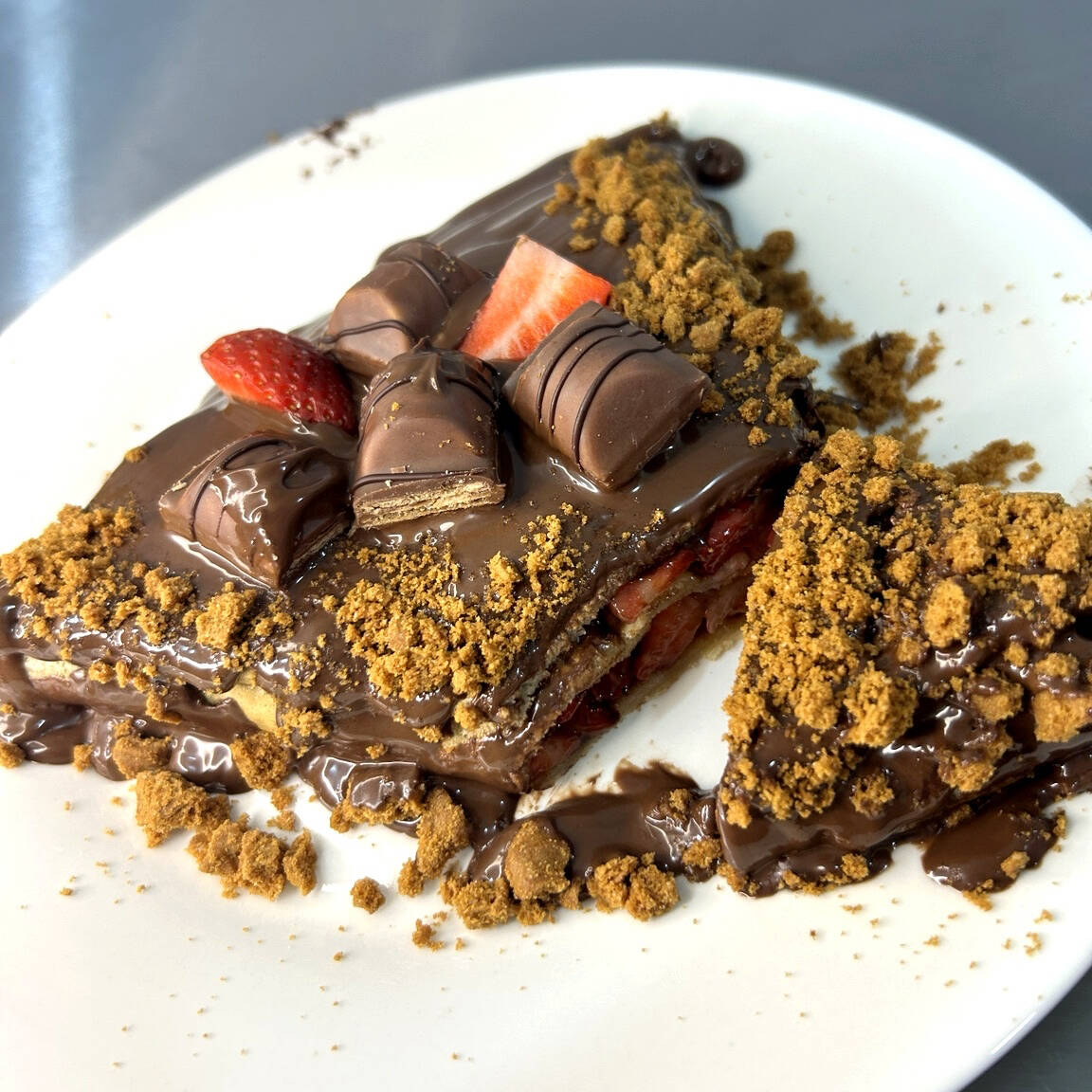 DELICIOSA CREPA RELLENA DE NUTELLA Y FRESAS , CUBIERTA DE NUTELLA,GALLETA LOTUS QUE LE DA UN CRUNCH INCREÍBLE Y ADEMÁS UN DELICIOSO CHOCOLATE KINDER BUENO.