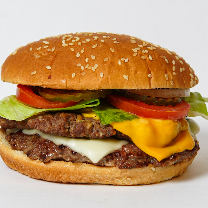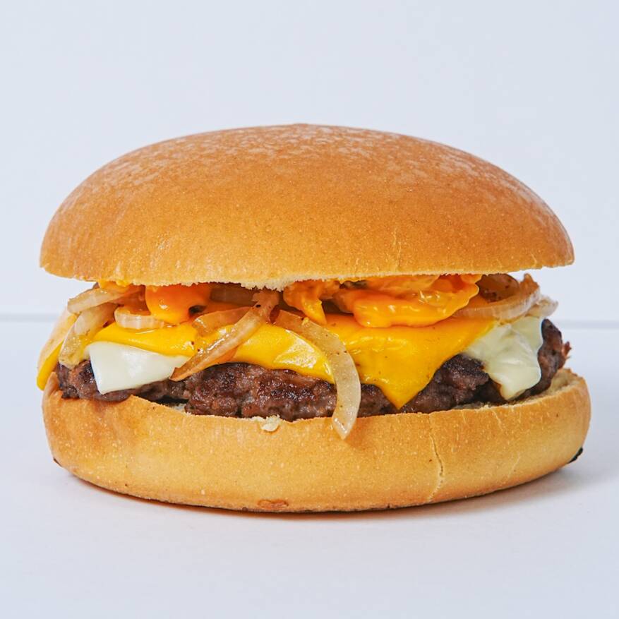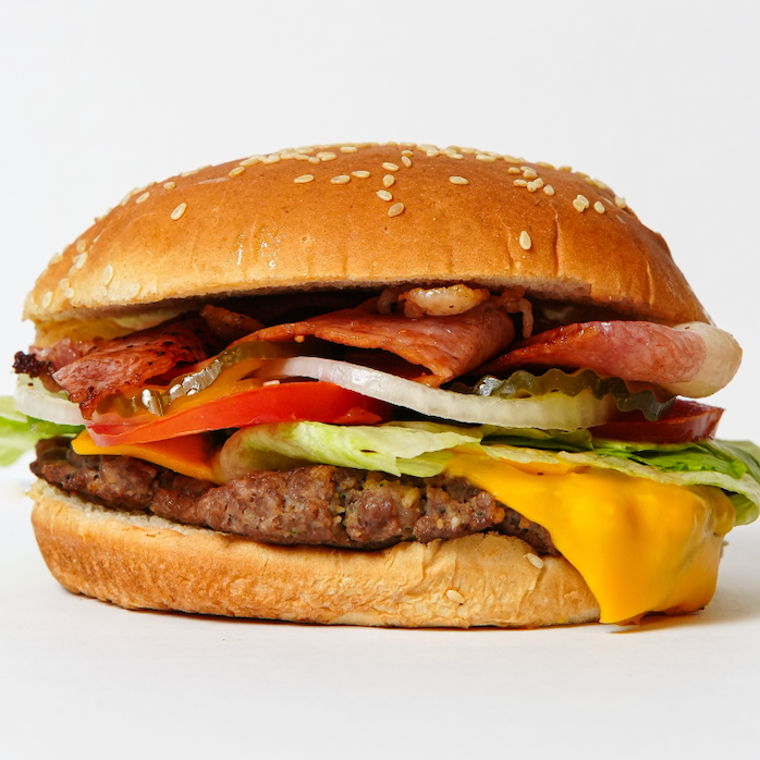 Carne 100% de res, queso amarillo tipo americano, huevo estrellado y tocino