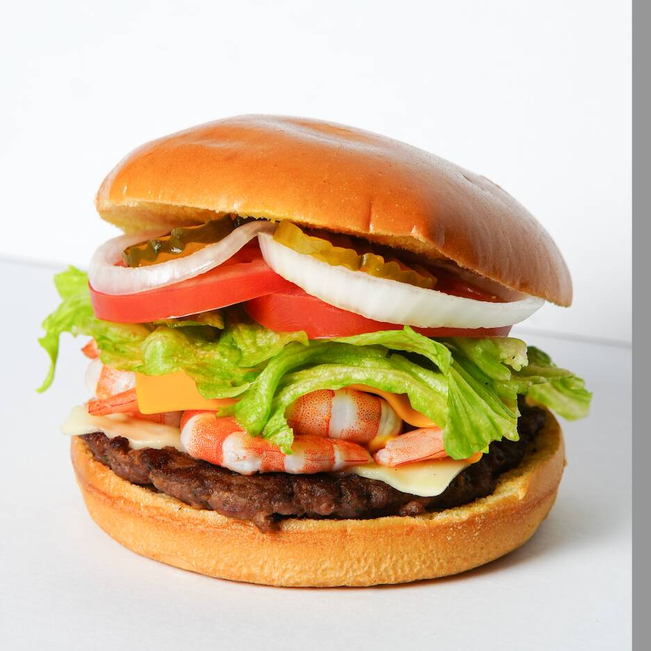 Bollo de hamburguesa grande, carne de res, queso amarillo tipo americano y queso manchego y camarones a la plancha