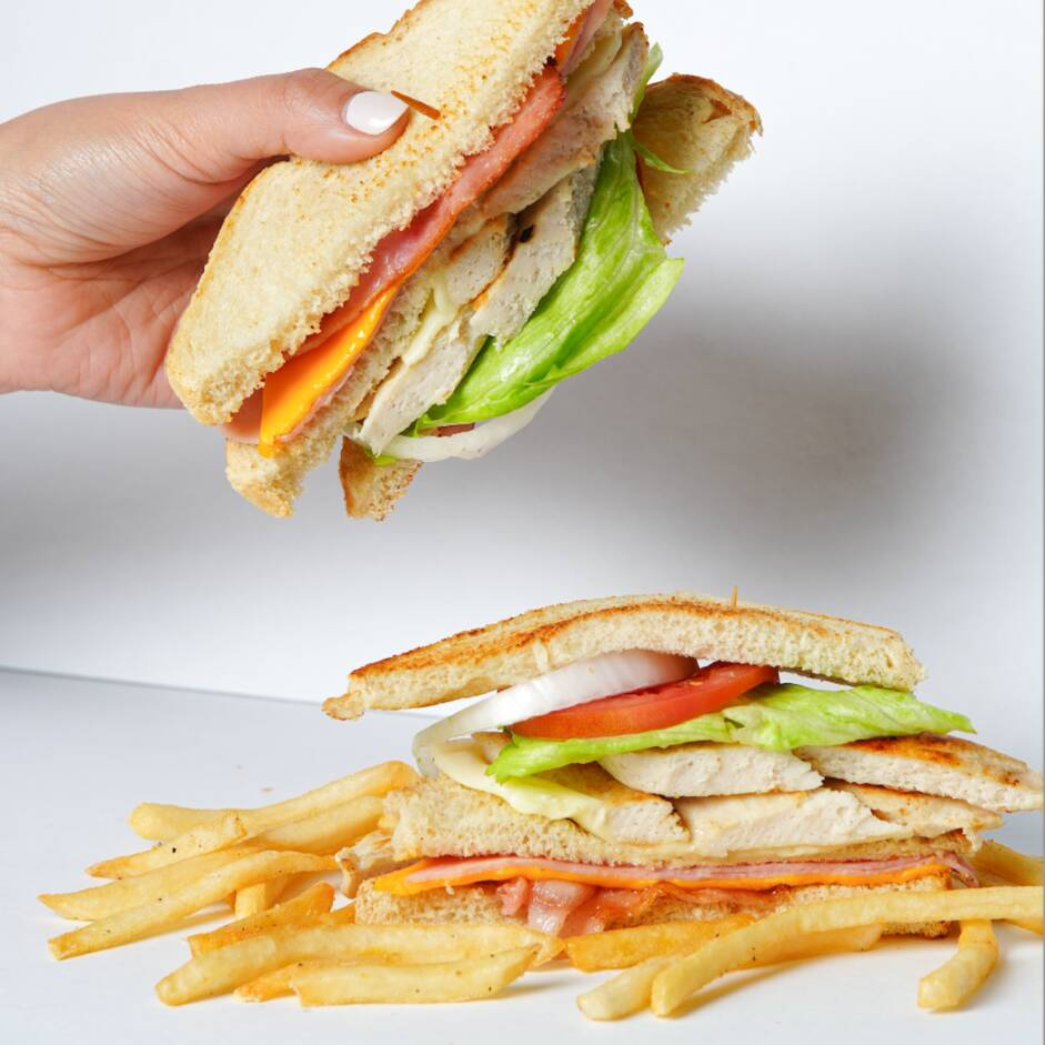 Pan blanco o integral, queso amarillo, queso blanco, jamón de pavo, tocino, pechuga a la plancha y papas a la francesa
