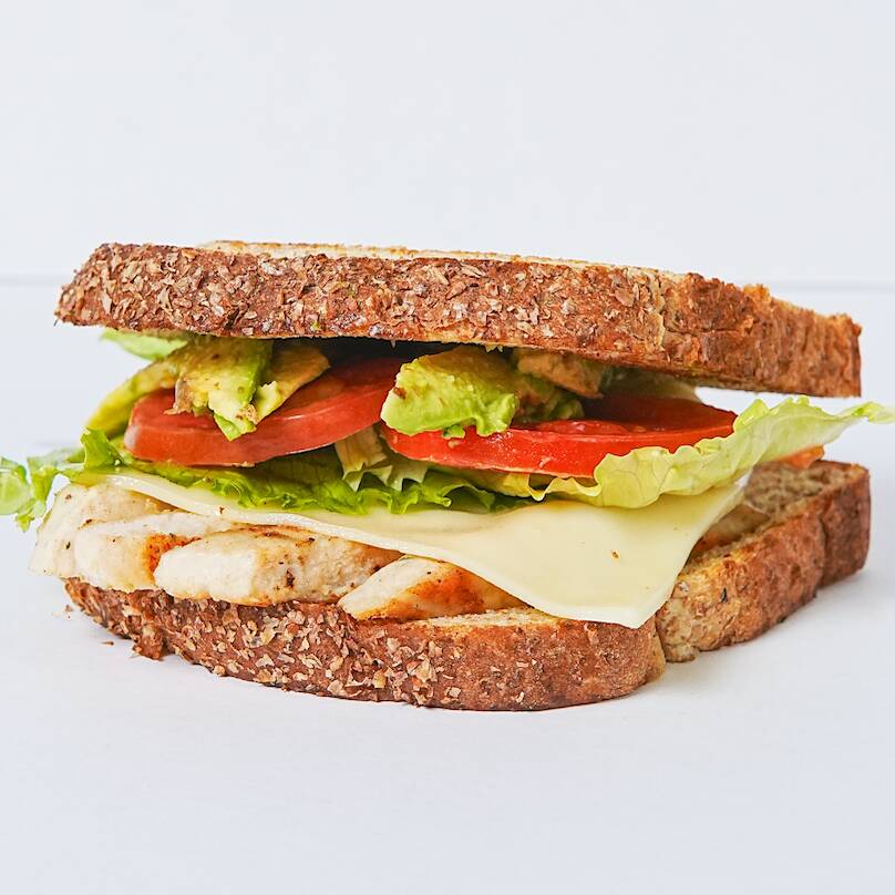 Pan blanco ó Integral, queso suizo-americano ó manchego, aguacate y pollo