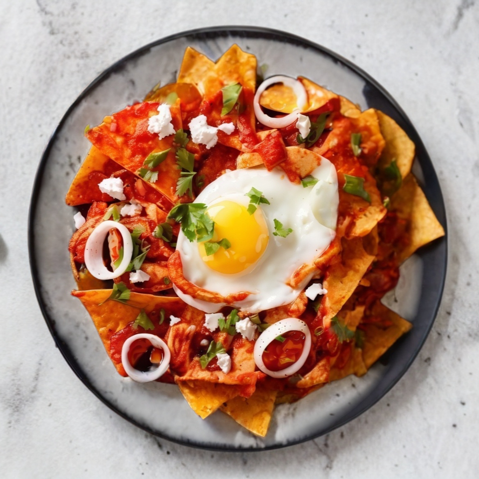 Deliciosos Chilaquiles rojos con salsa casera, con crema, cebolla, cilantro ,queso, frijoles y huevo estrellado o revuelto.
