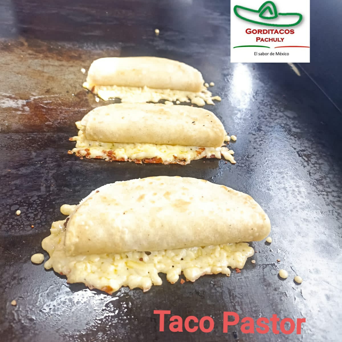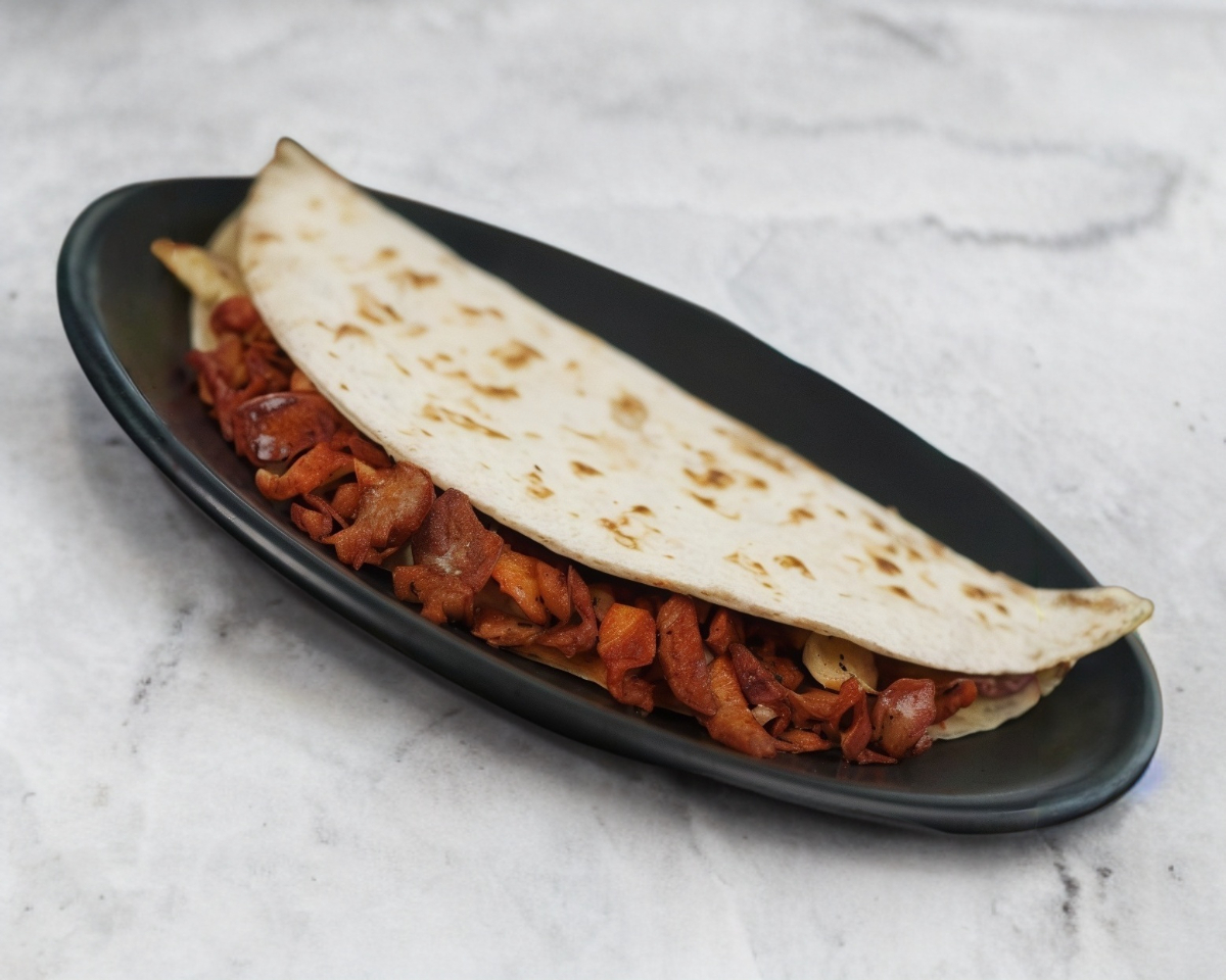 Tortilla harina, carne de pastor y queso mozzarella, acompañado de verdura y salsa.