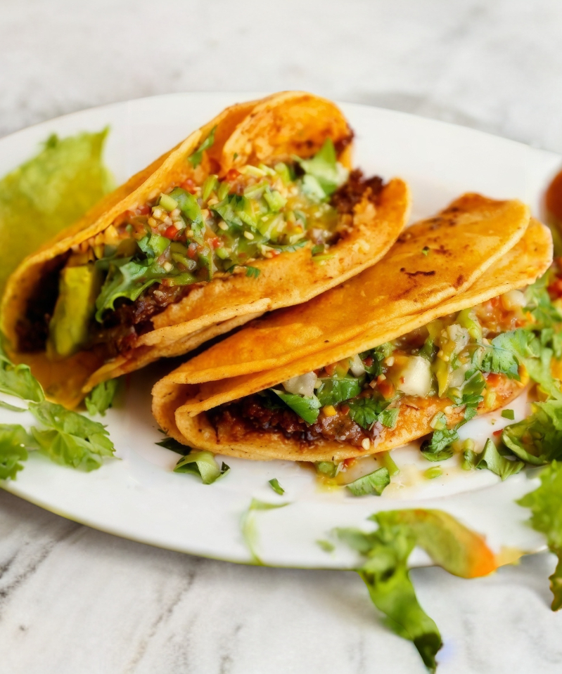 2 Tortillas de maíz, barbacoa de res y acompañado de verdura y salsa.