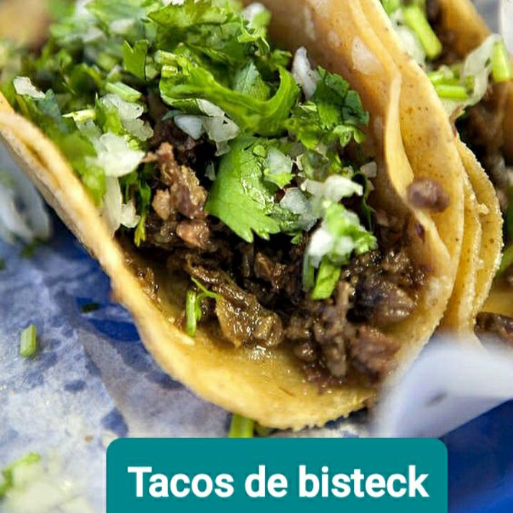 2 Tortillas de maíz mediana, bistec de res, acompañado de verdura y salsa.