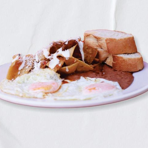 Chilaquiles (molcajete o rojos) con 2 huevos al gusto (revueltos, rancheros, estrellados, divorciados, con jamón o con chorizo) y frijoles refritos. Incluye porción de pan.