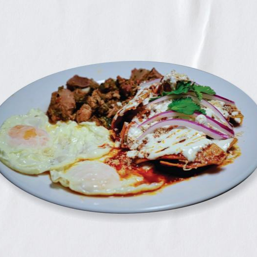 Chilaquiles (molcajete o rojos) con 2 huevos al gusto y 1 guisado con carne. Incluye porción de pan.