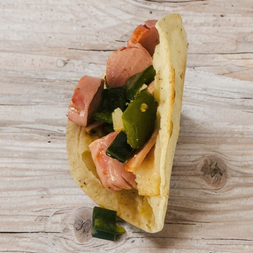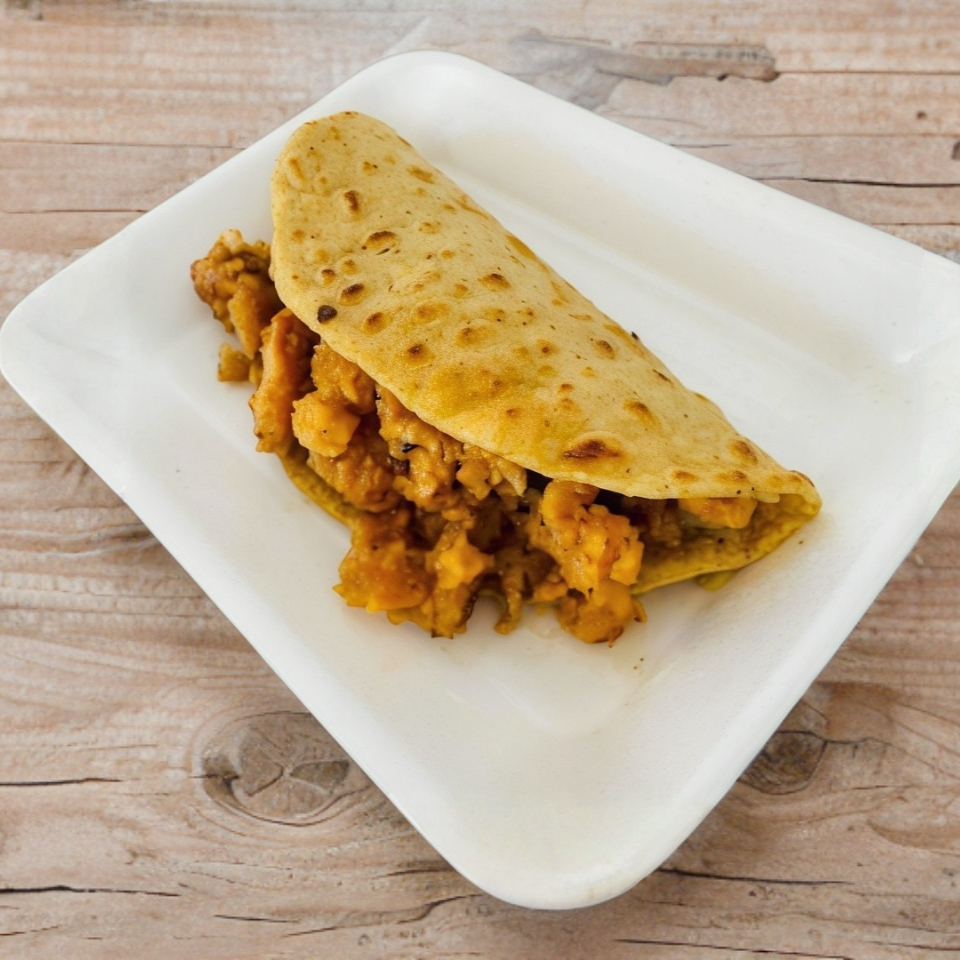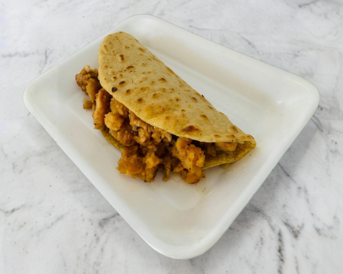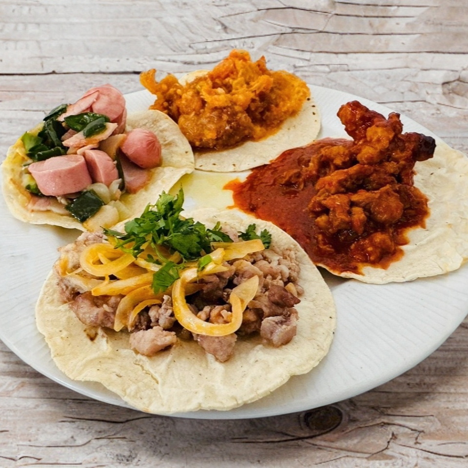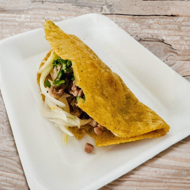 Delicioso taco, echo de masa de nixtamal dorada en manteca de puerco, queso asadero y hasta 2 guisados caseros premium