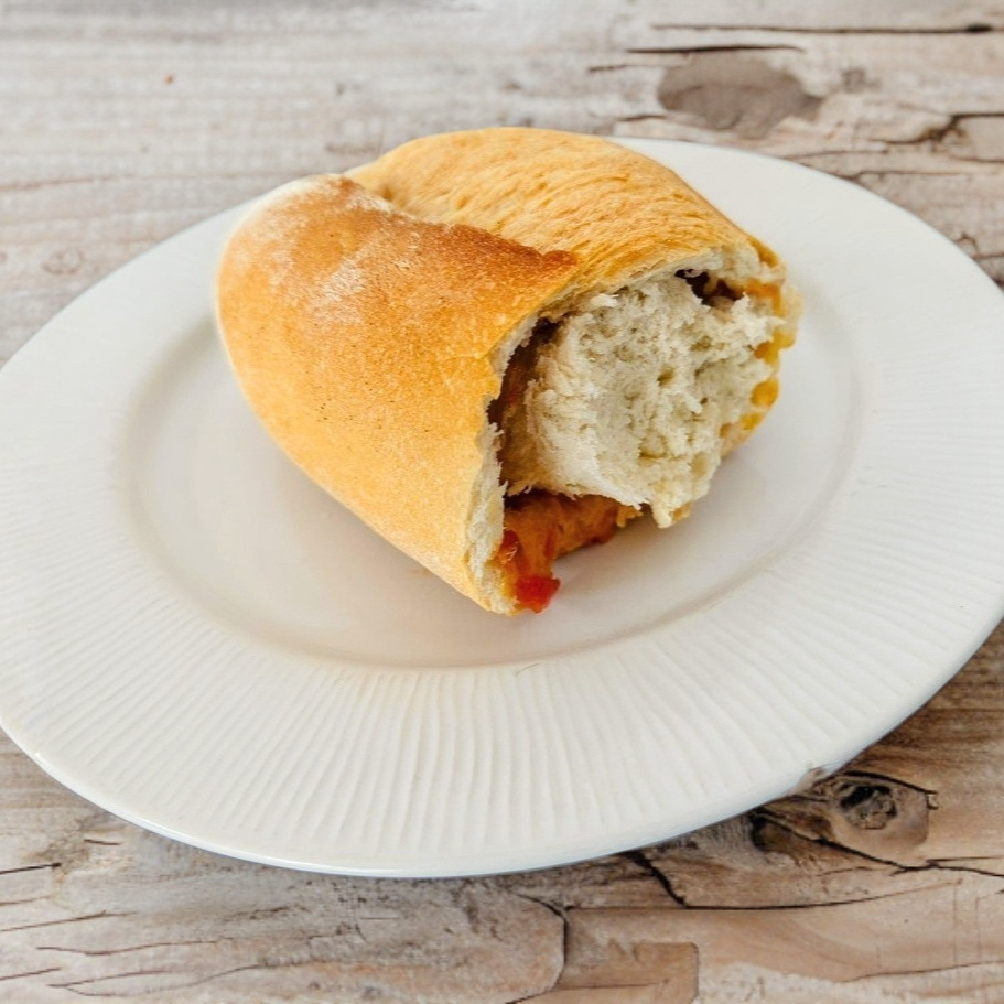Bolillo de la casa un poco dorado con manteca de cerdo, con jugoso bistec de cerdo