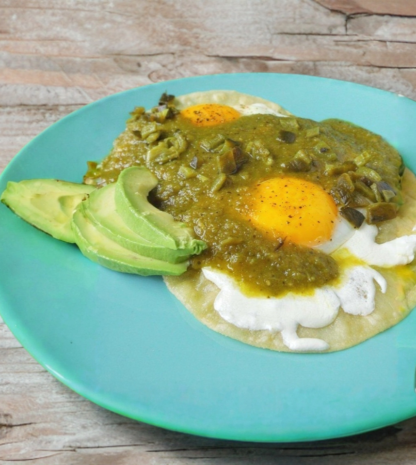2 Huevos estrellados, montados en tortilla frita bañados en salsa verde y roja, servidos con frijoles y queso, incluye bolillo rebanado.