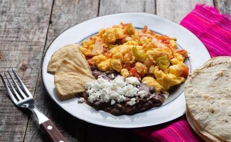 2 Huevos revueltos con cebolla, jitomate y chile serrano picado, servidos con frijoles y queso, incluye bolillo rebanado.