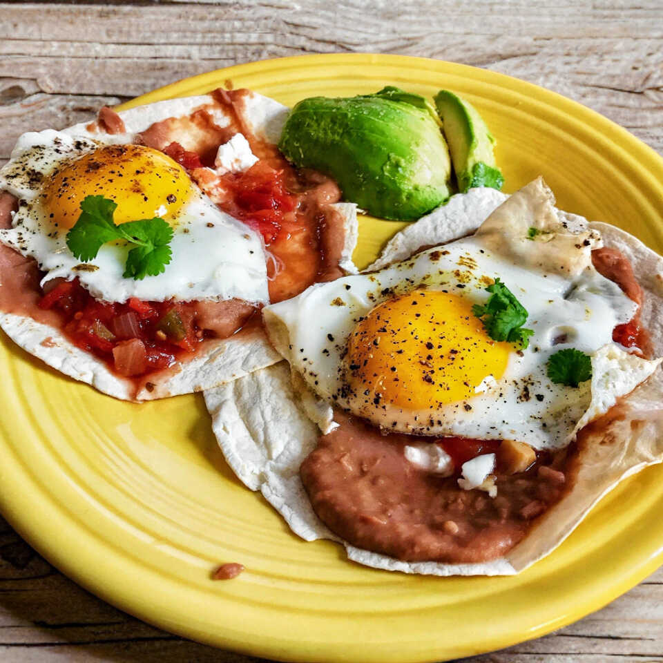 2 Huevos estrellados, montados en tortilla frita, bañados con salsa ranchera, servidos con frijoles y queso, incluye bolillo rebanado.