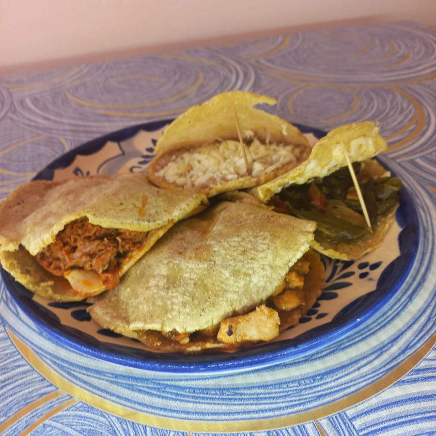 Gordita de maiz rellena de trocito de cerdo en salsa