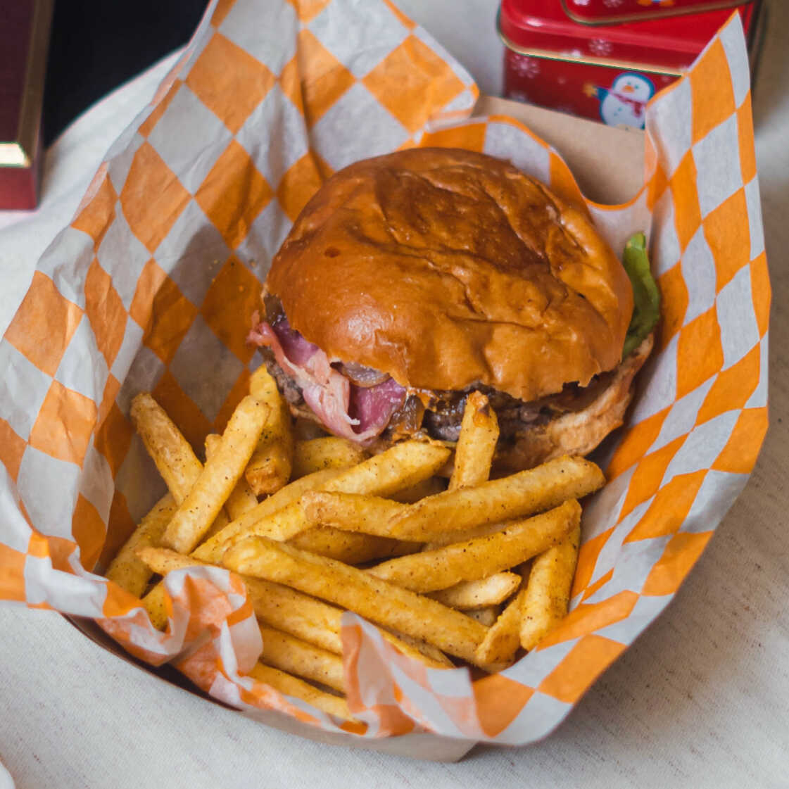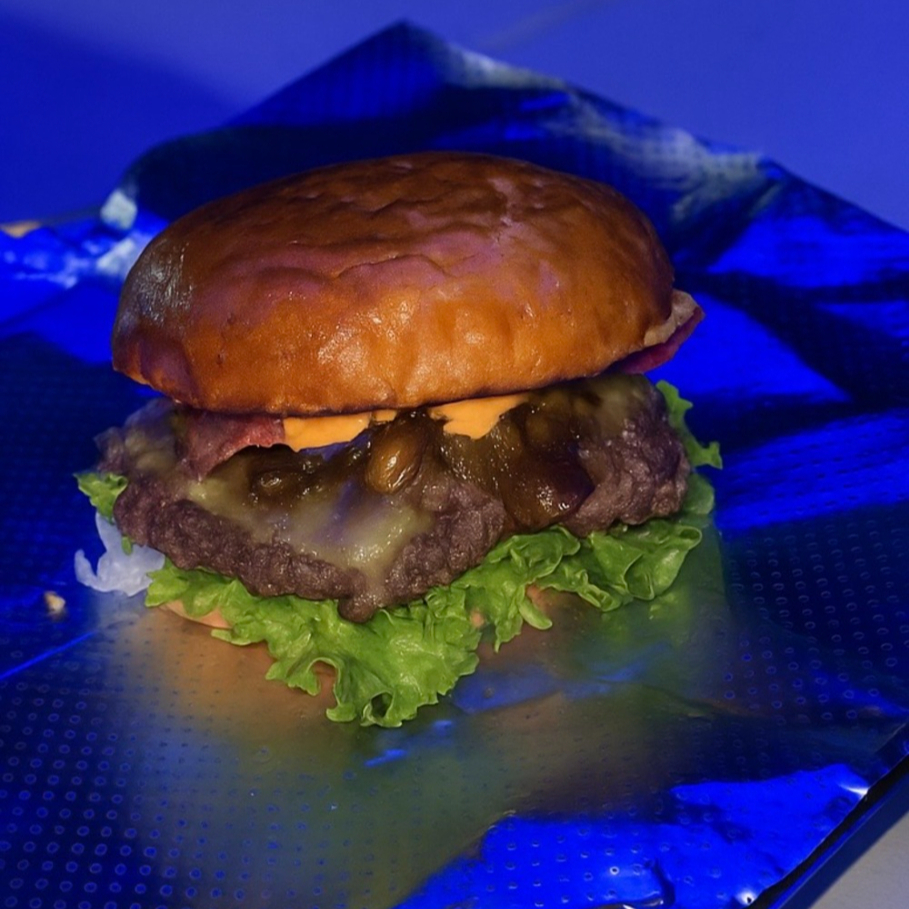 Jugosa carne de res (100 g) con tocino, cebolla caramelizada, queso gouda, jitomate, lechuga y aderezo de la casa picante en pan suave. Incluye 150 g de papas a la francesa.