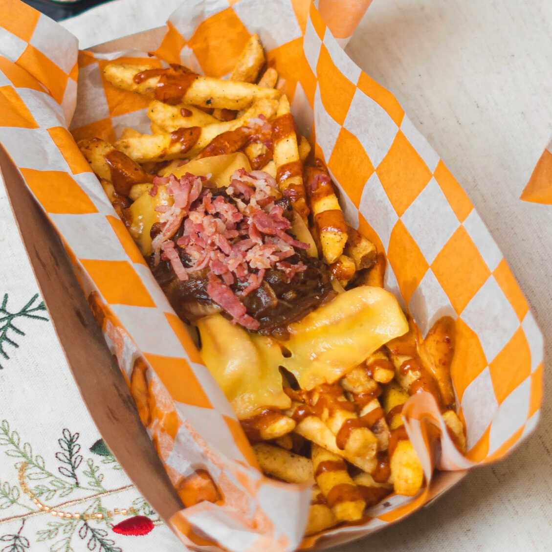 Nuestra especialidad: Papas a la francesa cargadas con tocino, cebolla caramelizada picante, queso gouda fundido y el toque especial del aderezo de la casa picante.