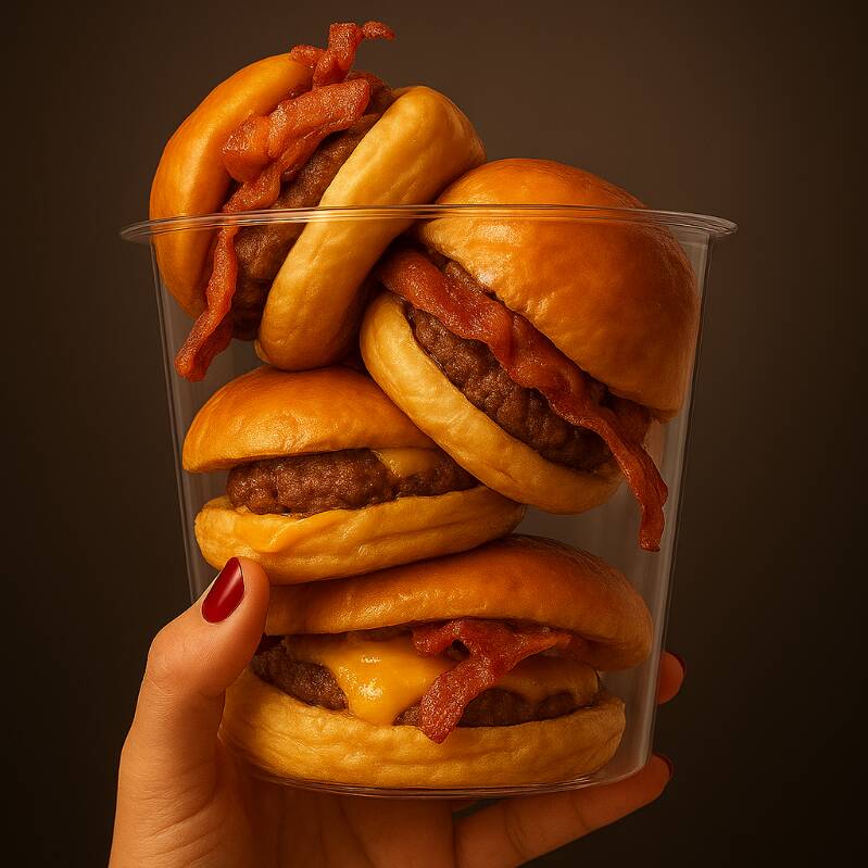 Vaso de 4, mini Burguer, de buen tamaño, con queso, carne, tocino, Mitad queen mitad boy