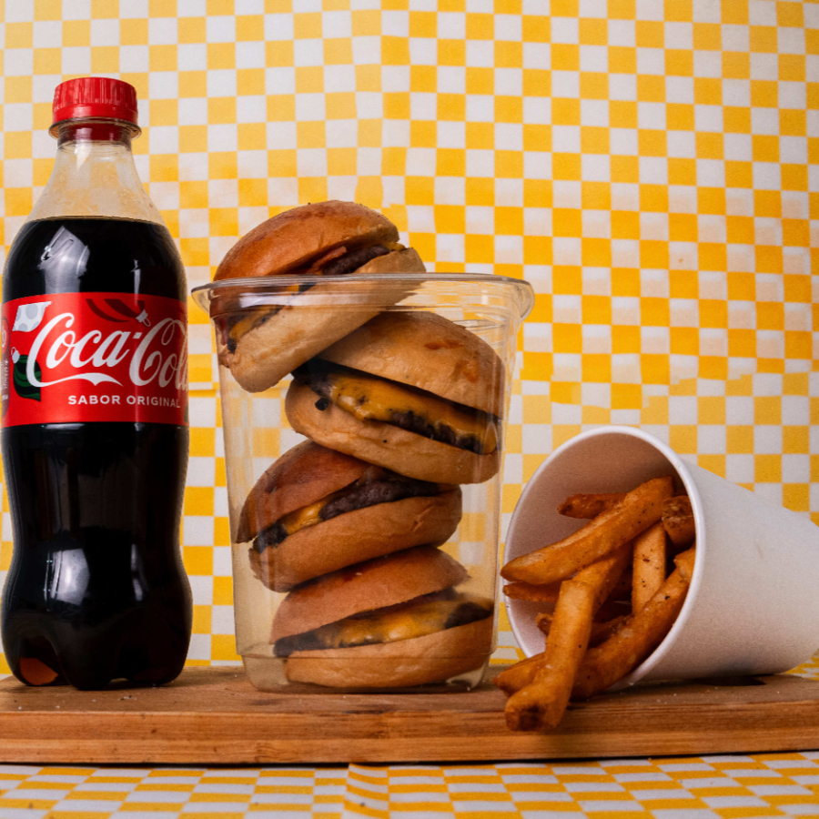 Vaso de cuatro piezas con mini Burgers, de buen tamaño, con queso, carne, tocino y la salsa spicy de la casa