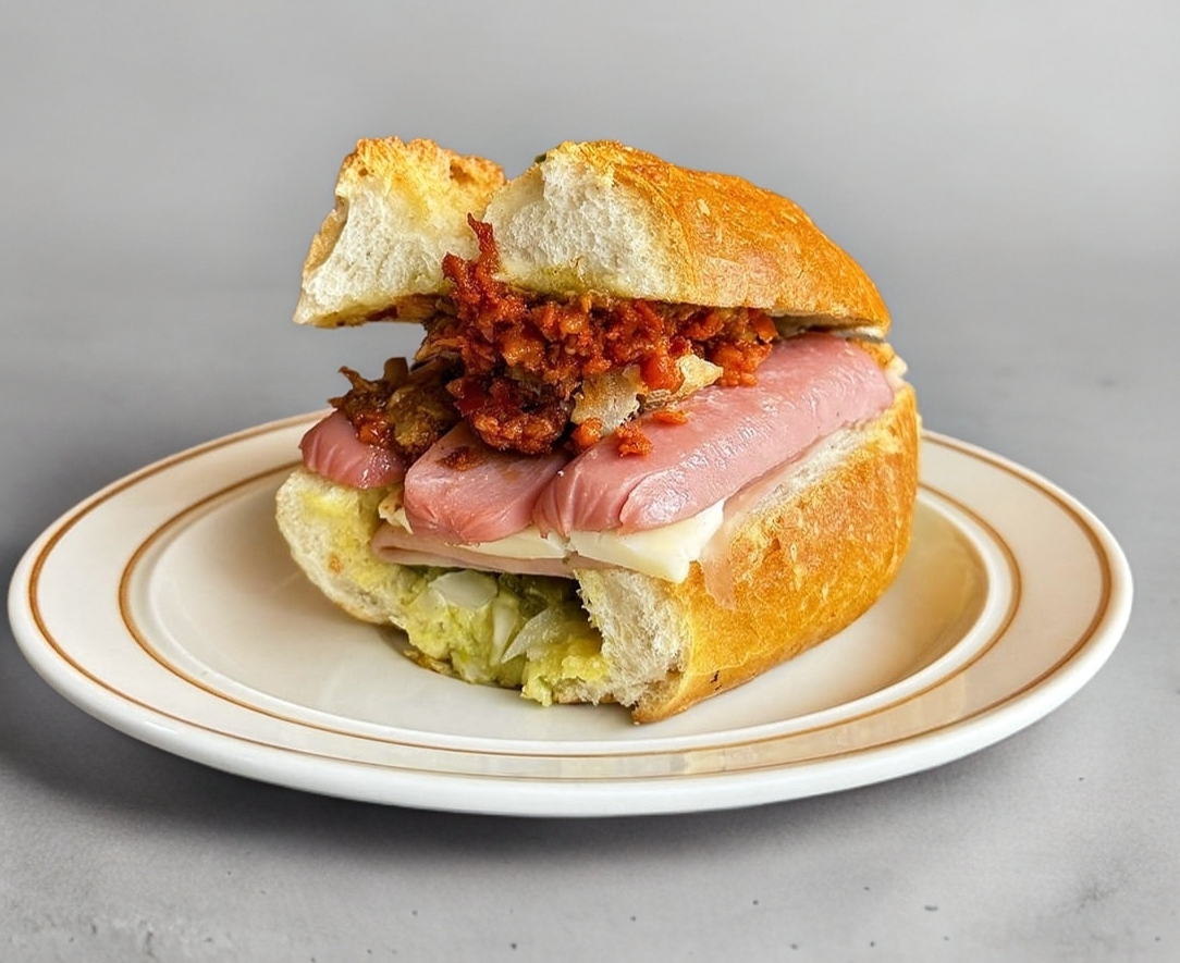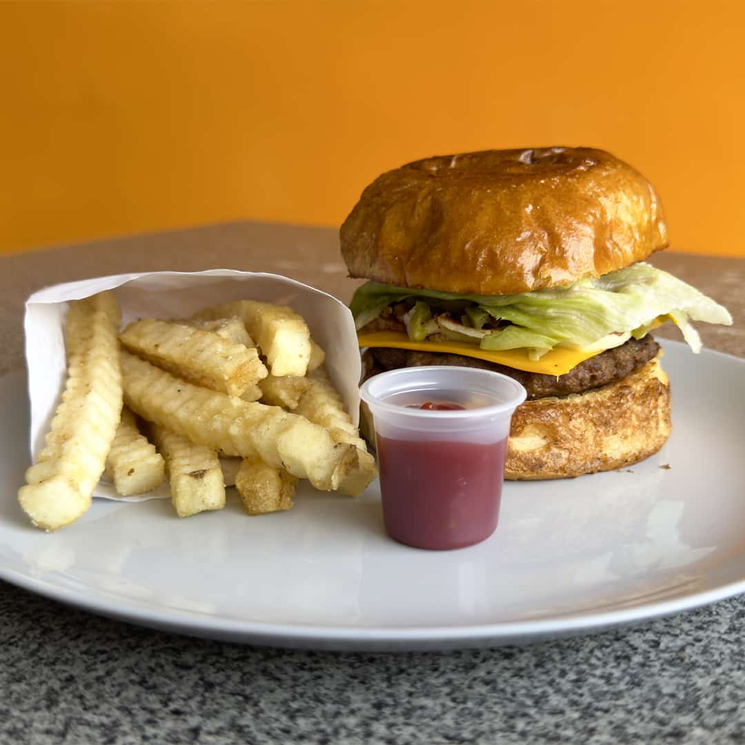 Tocino, queso, 130 gr de carne de res, incluye 160 grs de papas a la francesa.