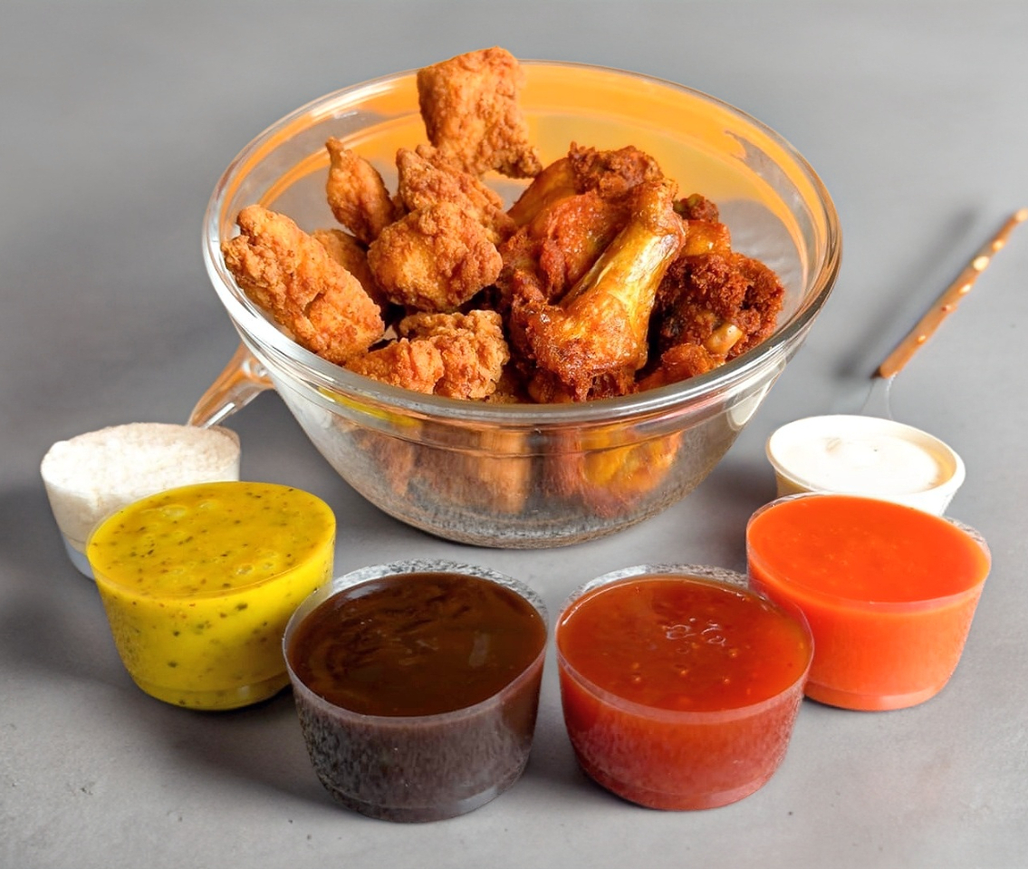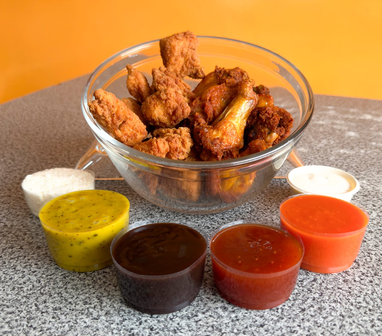 Pollo frito 260 gr bañado en una de nuestras exquisitas salsas. Elige tu favorita. Acompañada de los siguientes ingredientes: lechuga, jitomate, cebolla, pepinillos, chile jalapeño. Complemento de 160 grs de papas a la francesa.