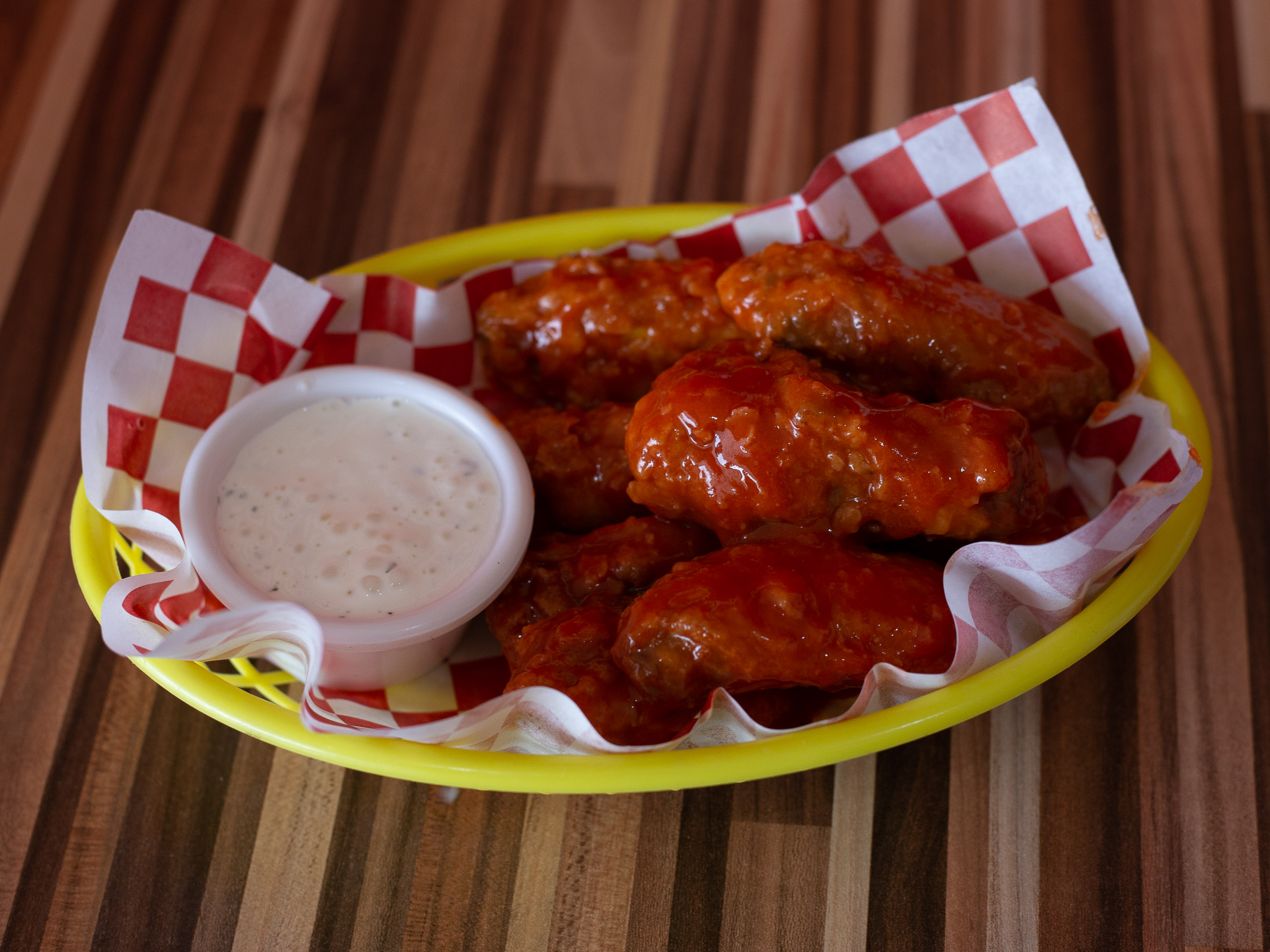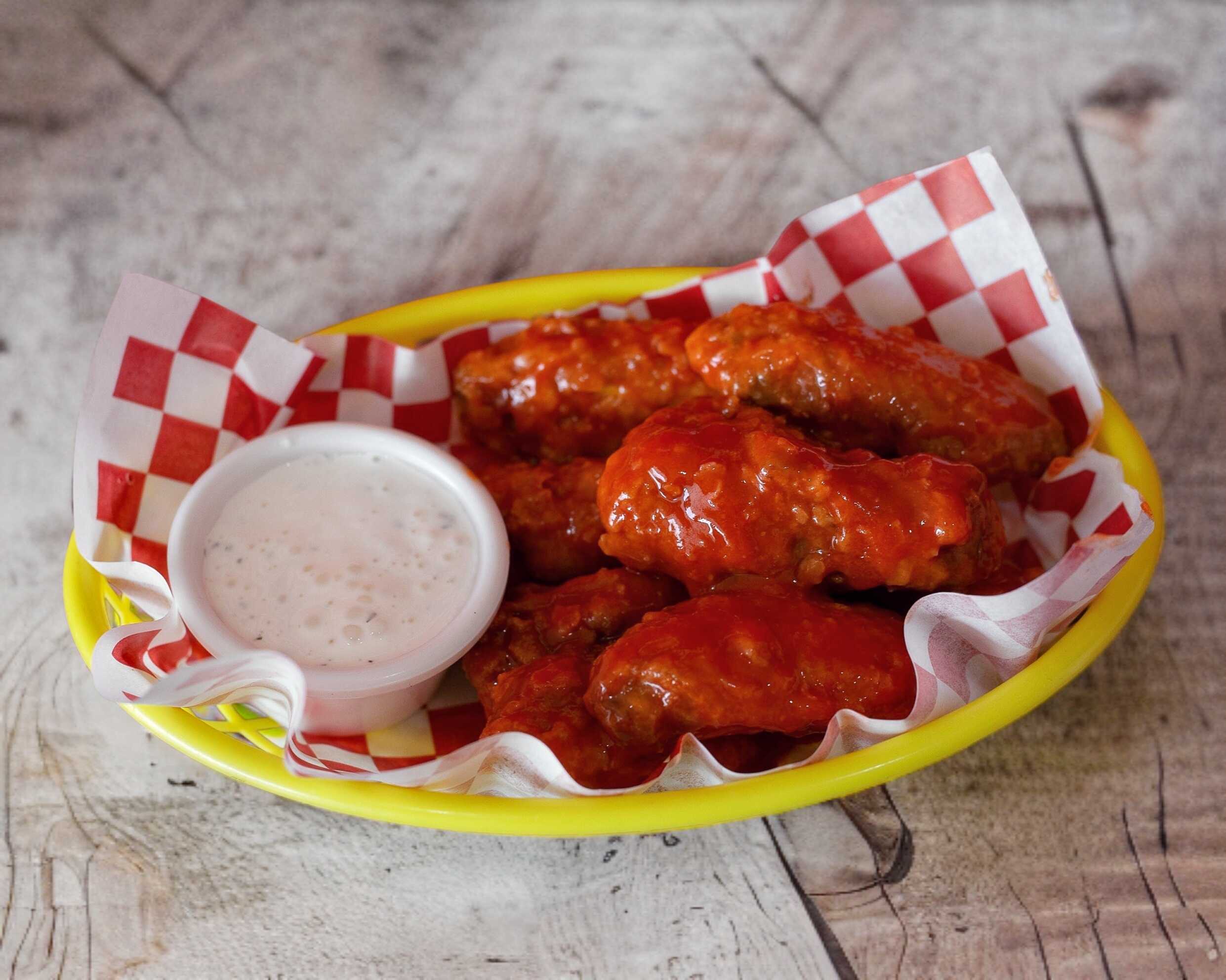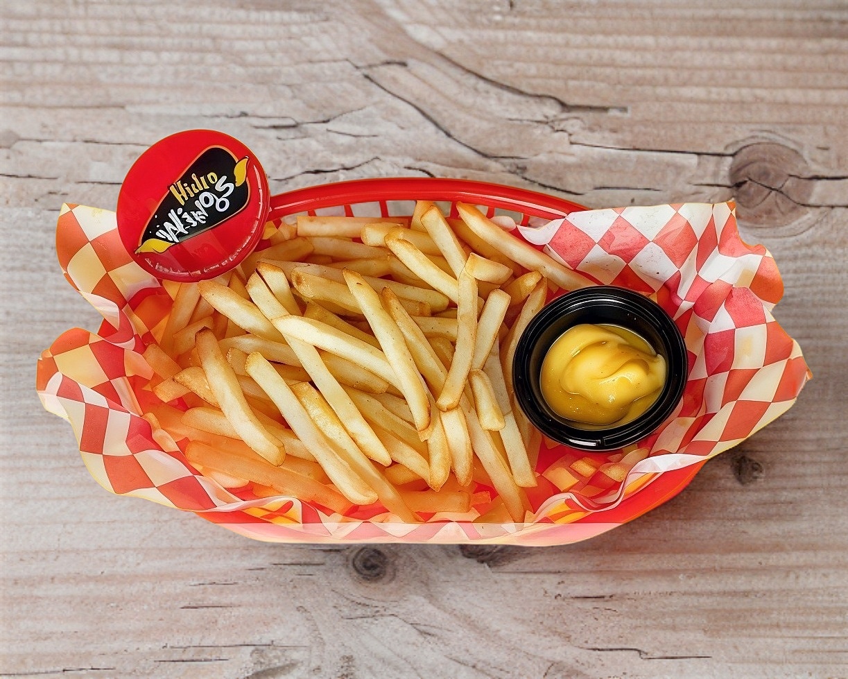 Crujientes papas a la francesa con 4 alitas búfalo, queso amarillo y aderezo ranch.
