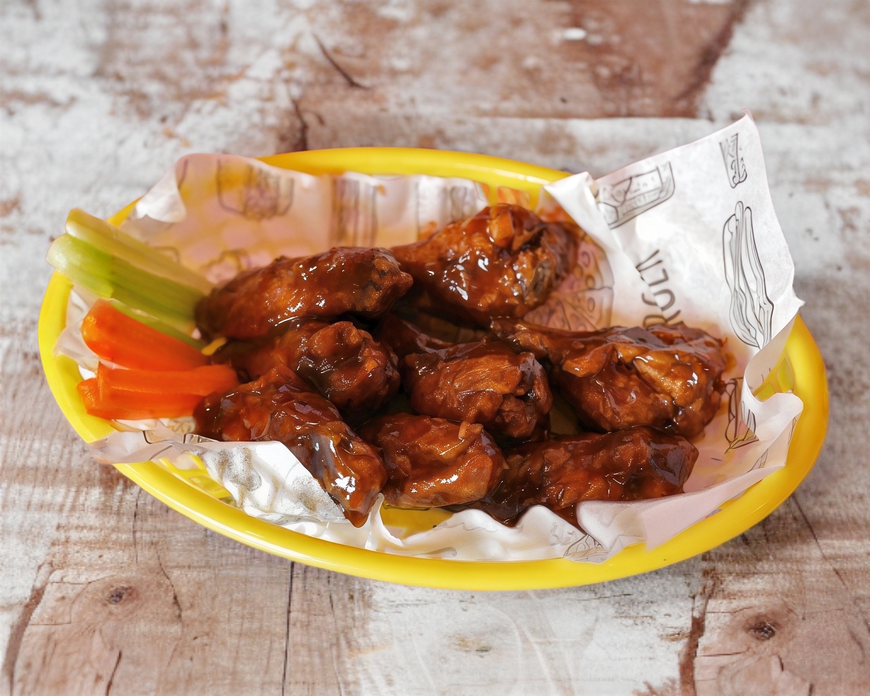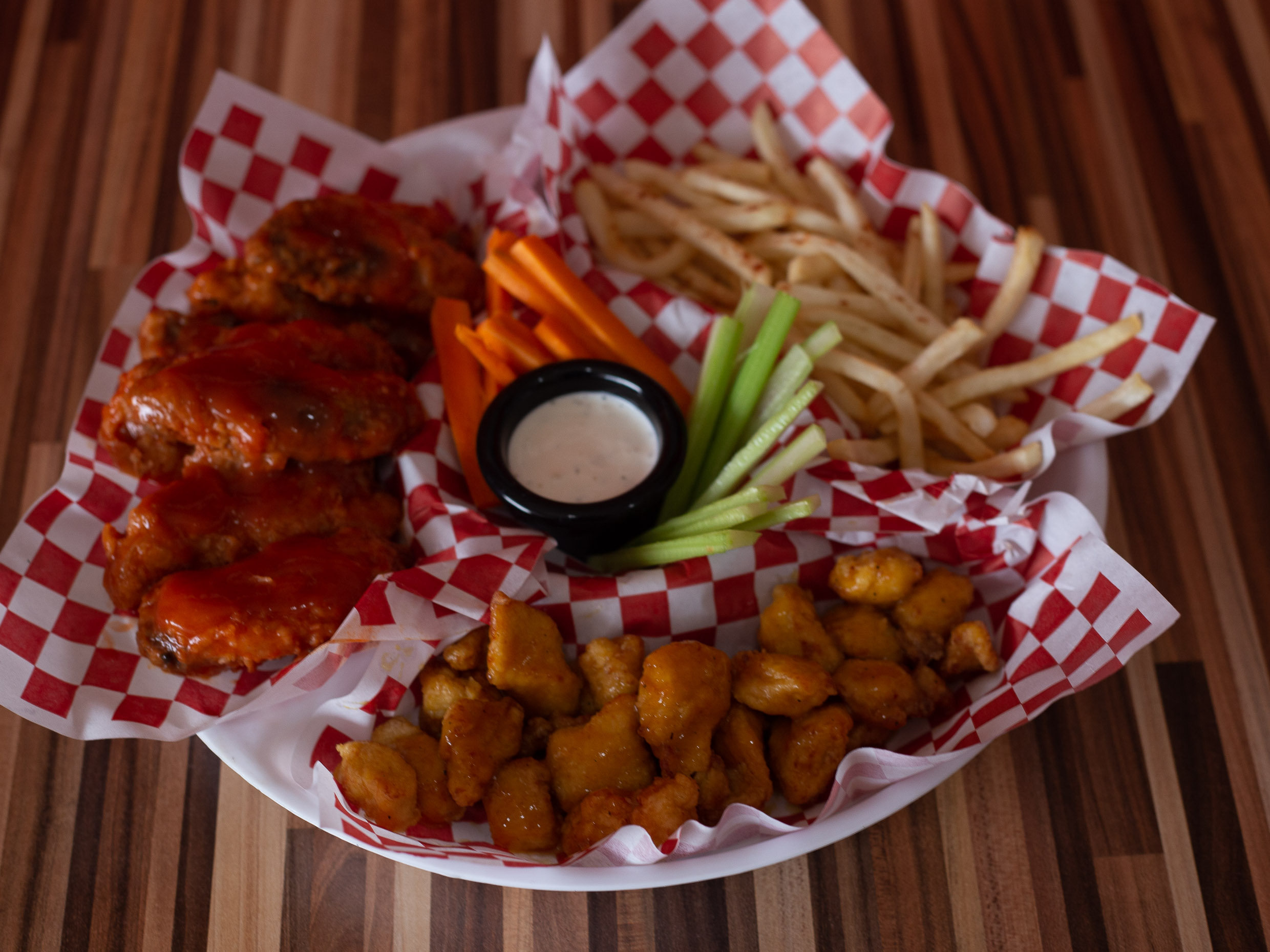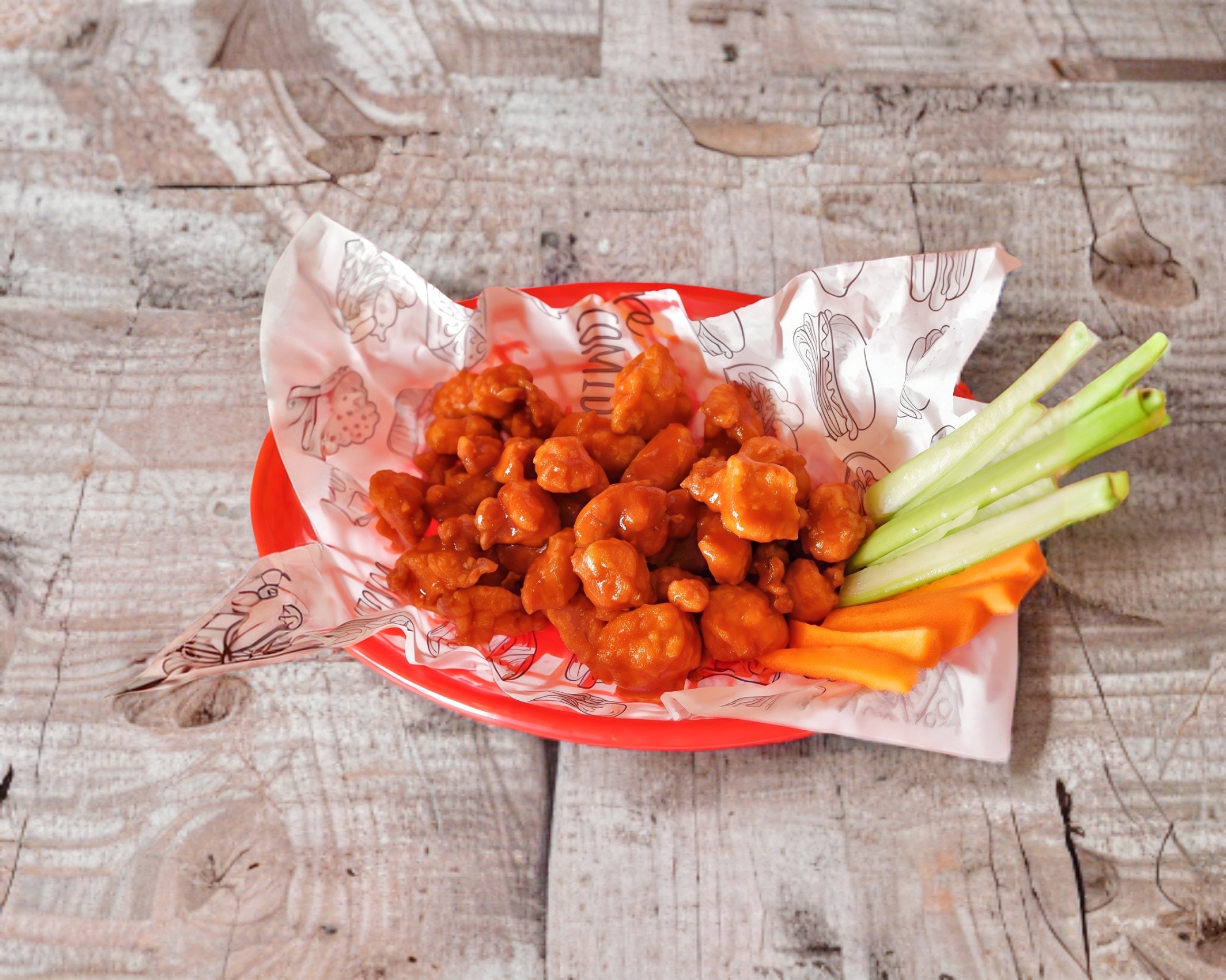 8 Alas, 200 gramos boneless, papas grandes y aros de cebolla.