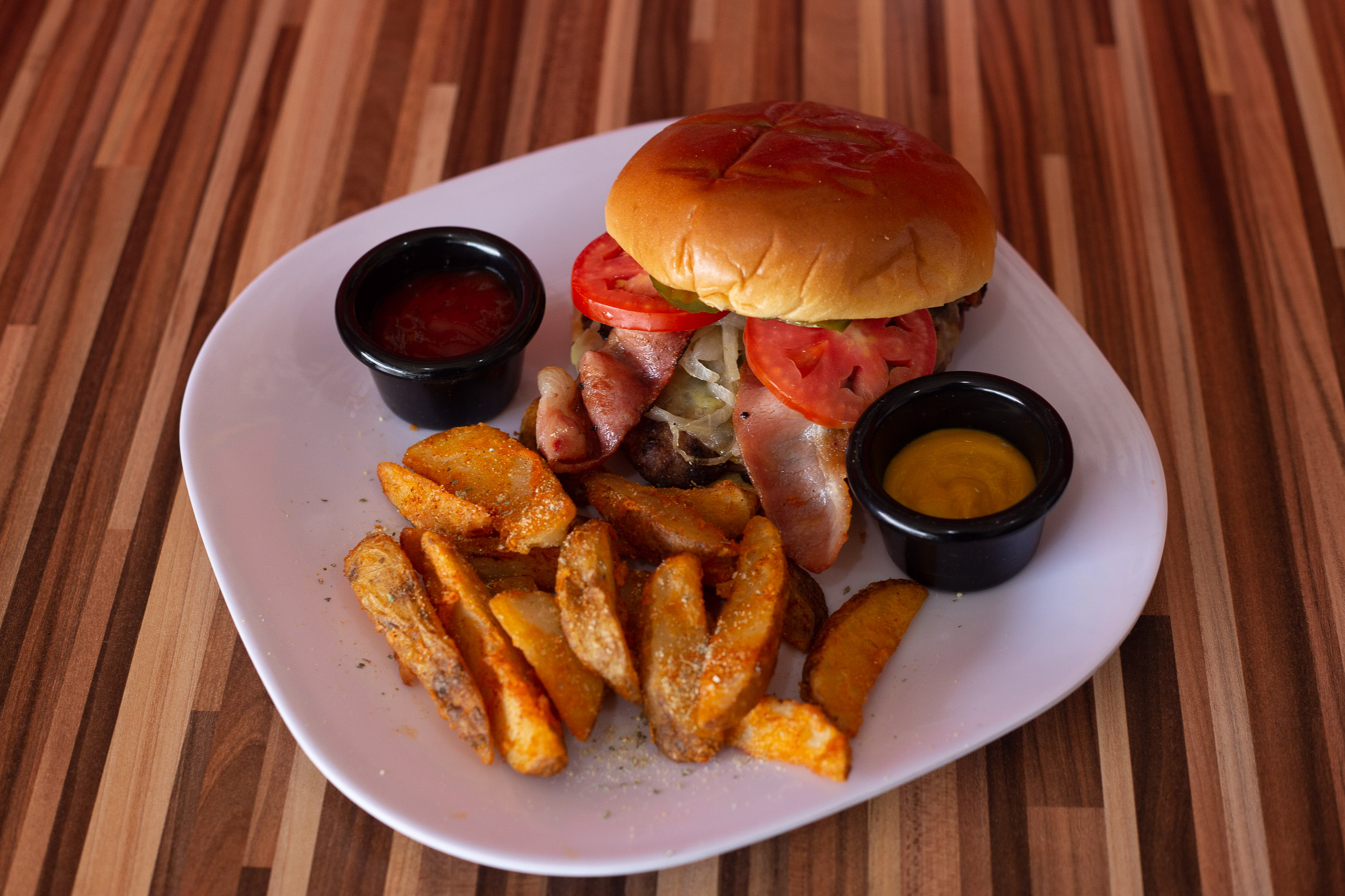200 Gramos de carne Premium con queso gouda, tocino y cebolla caramelizada, con papas gajo con parmesano.