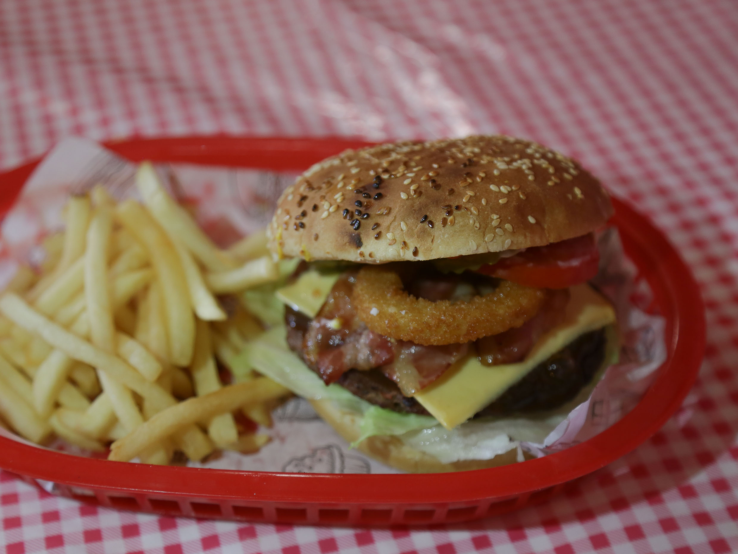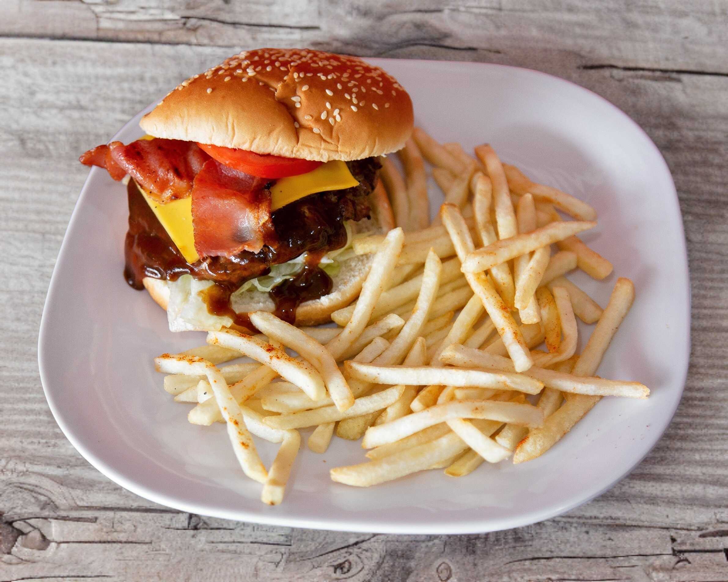 Queso amarillo, tocino, aro de cebolla y salsa BBQ.