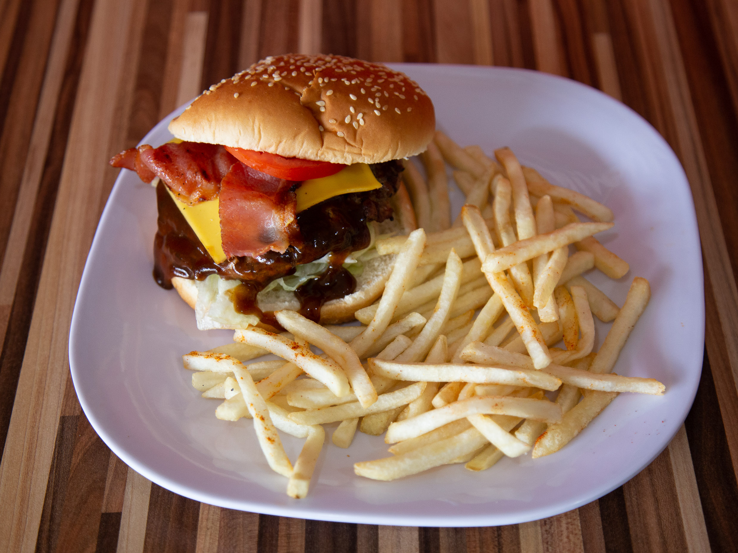Queso amarillo, tocino y salsa BBQ.