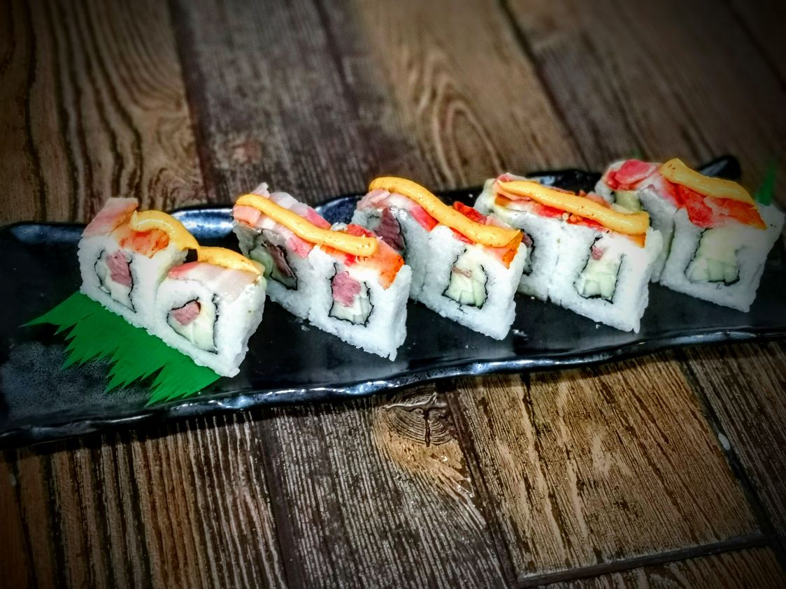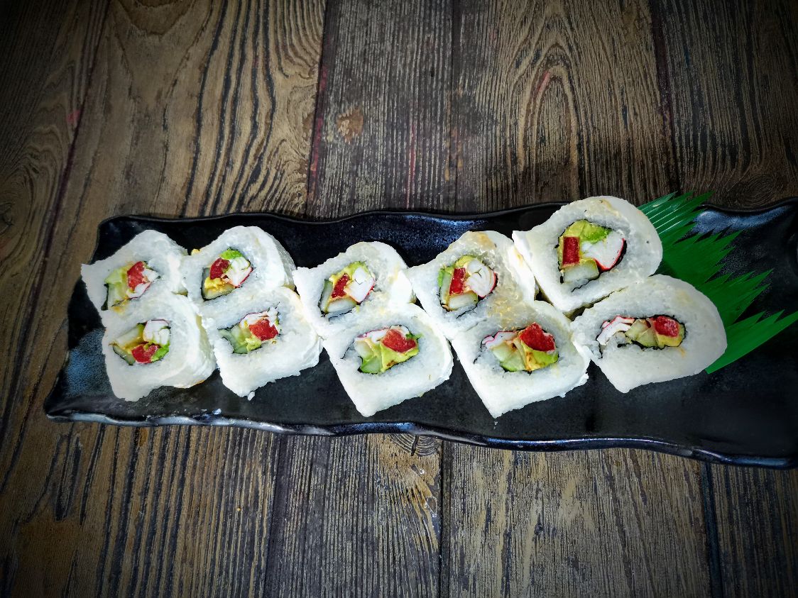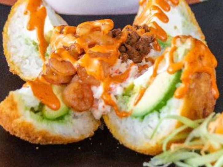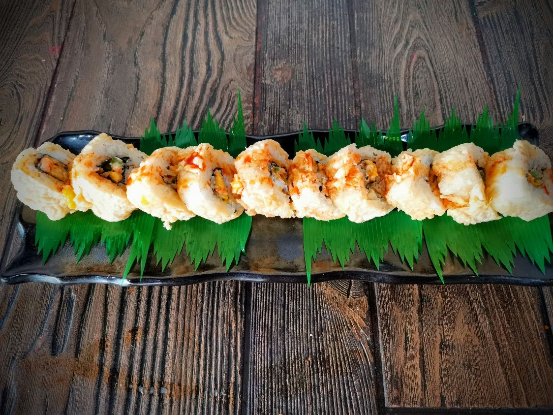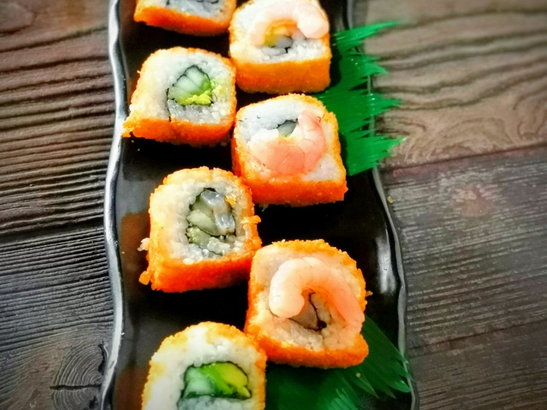 FUERA EMPANIZADO Y SALSA SHIRASHA - DENTRO CAMARON, PEPINO Y AGUACATE