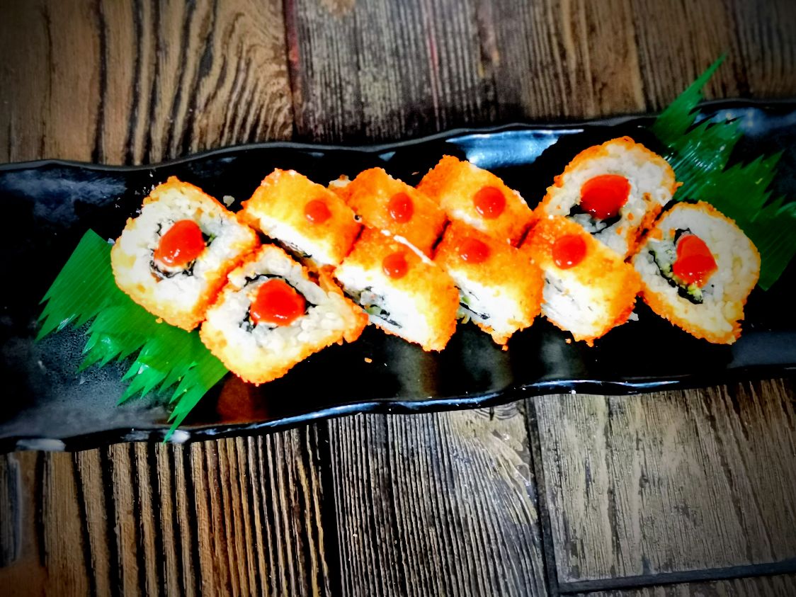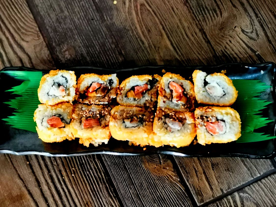 fuera de empanizado y salsa de anguila - dentro salmón, camarón y queso crema (10 bocados)(paga 2 y lleva el 3 gratis)