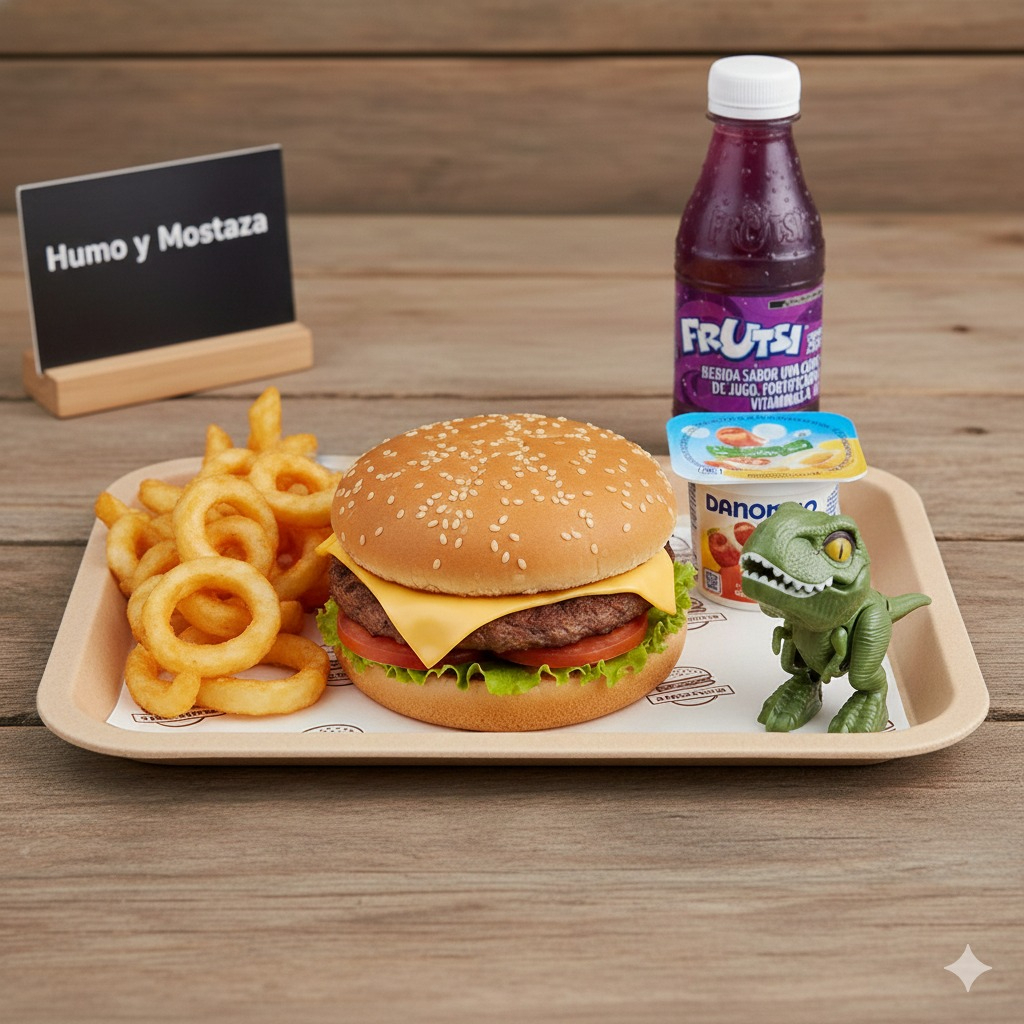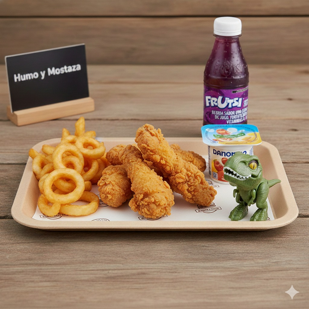 Baby burger, papitas a la francesa, juguito, yogurt de fresa y un juguete sorpresa
