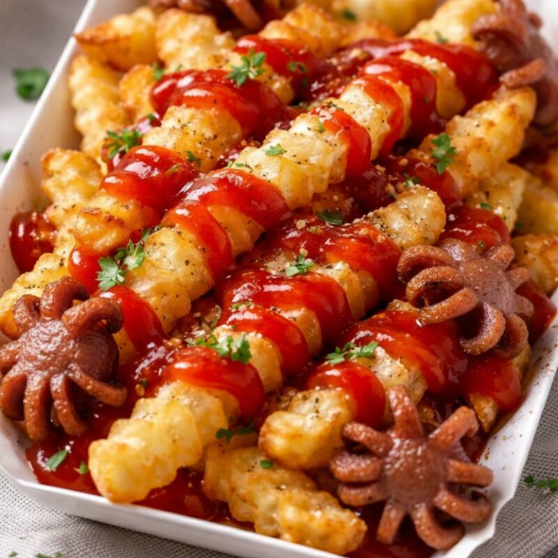 Salchipulpos, aros de cebolla y dedos de queso sobre una cama de papas a la francesa