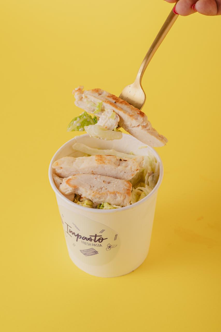Ensalada con base de lechuga con pollo y aderezo cesar.