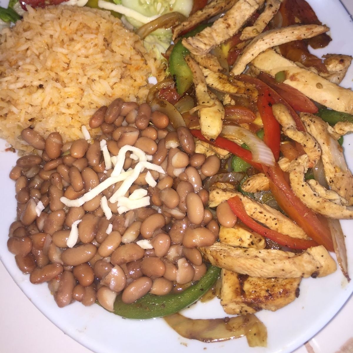 Tiritas de arranchera guisada con cebolla, jitomate, chile acompañado de arroz, frijoles, y 5 tortillas