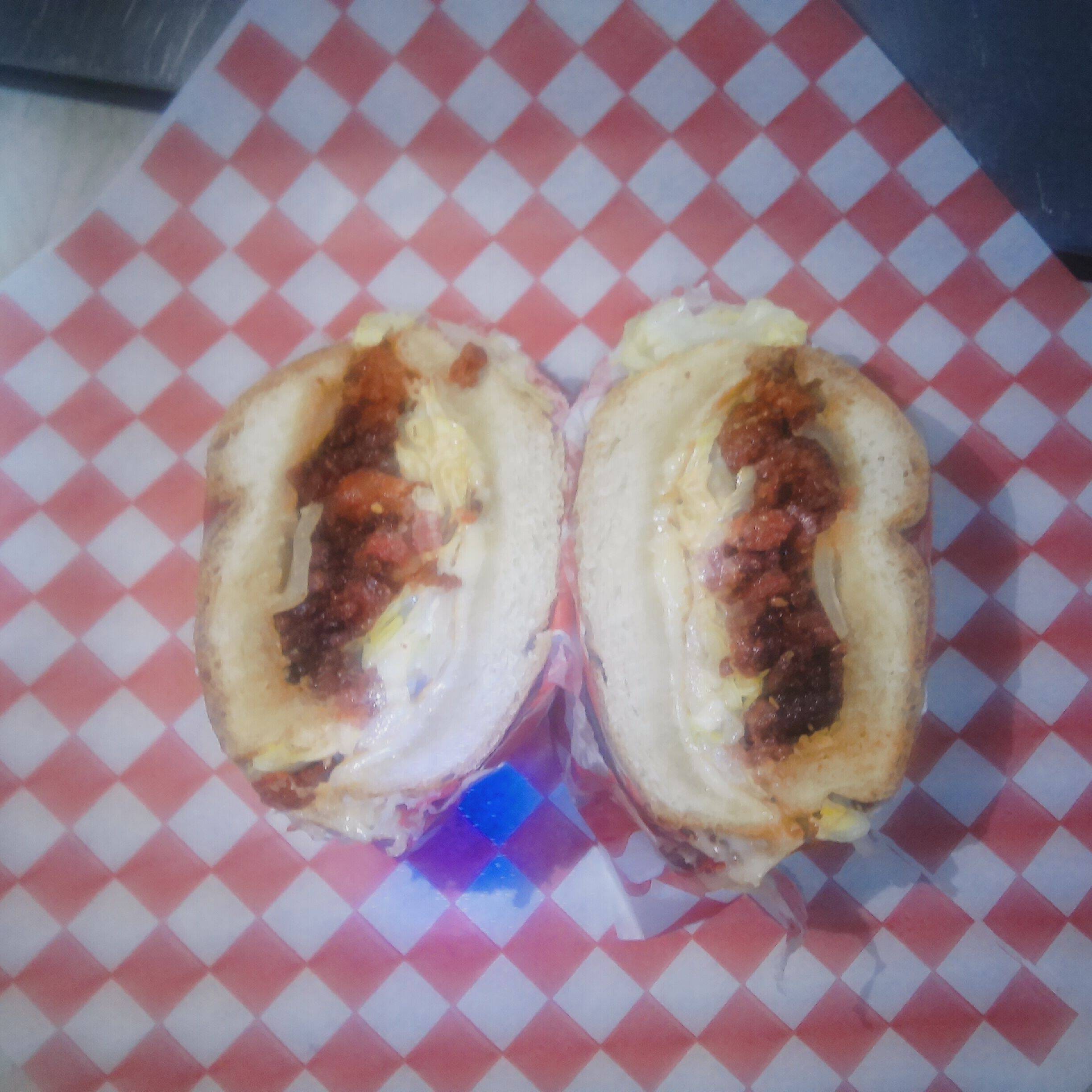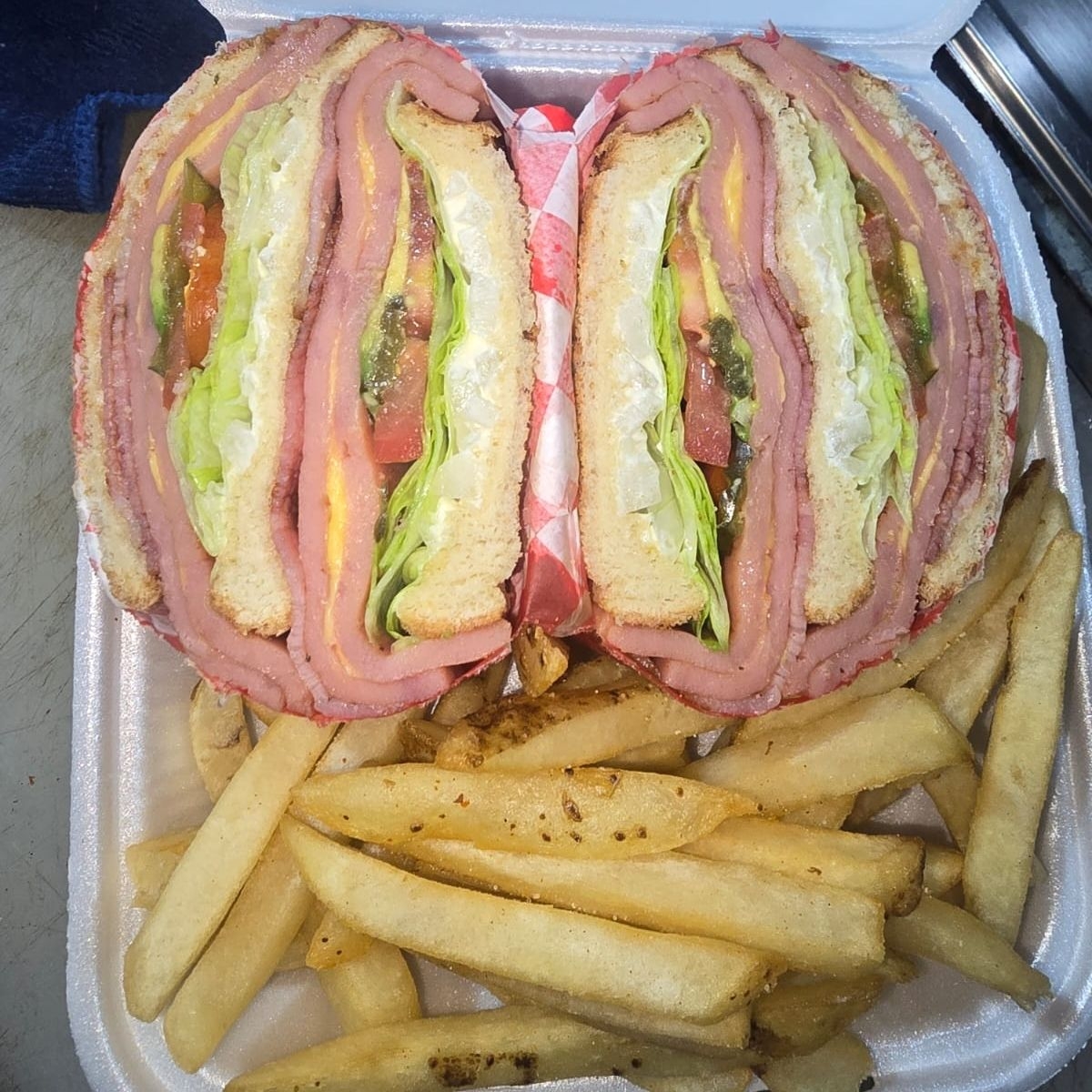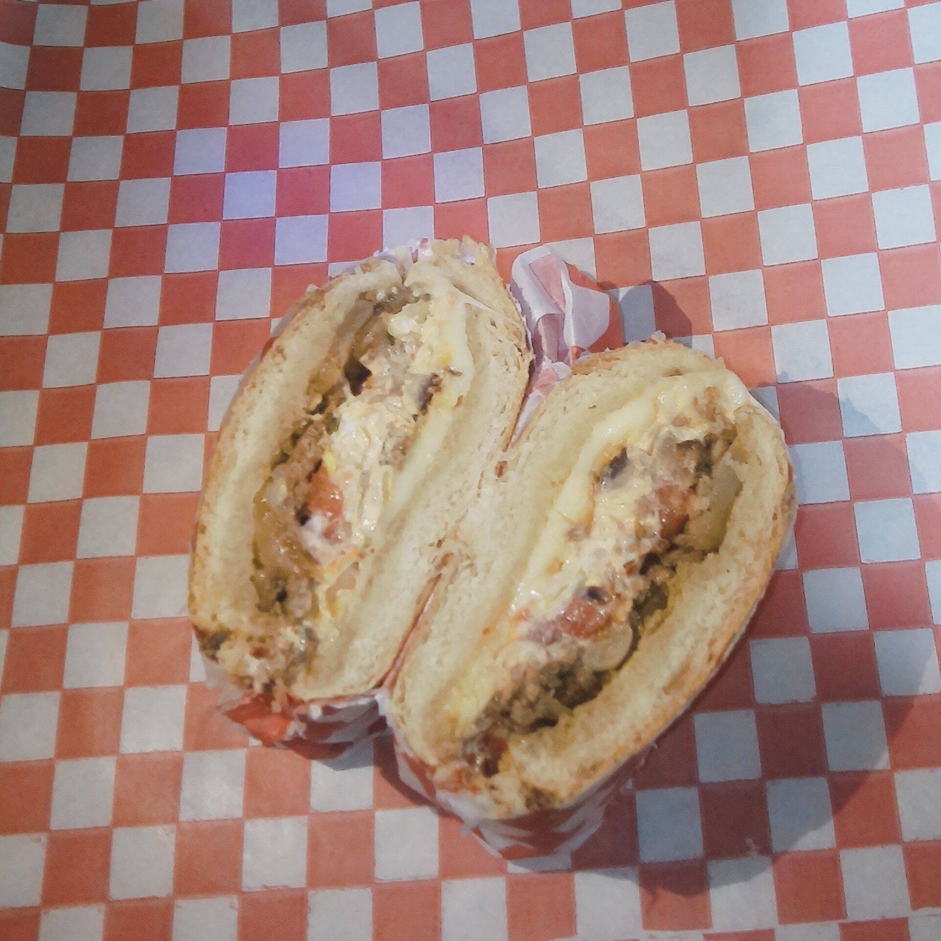 Bolillo, mayonesa,carne,queso,letchuga, jitomate,crema y aderezo especial de la casa