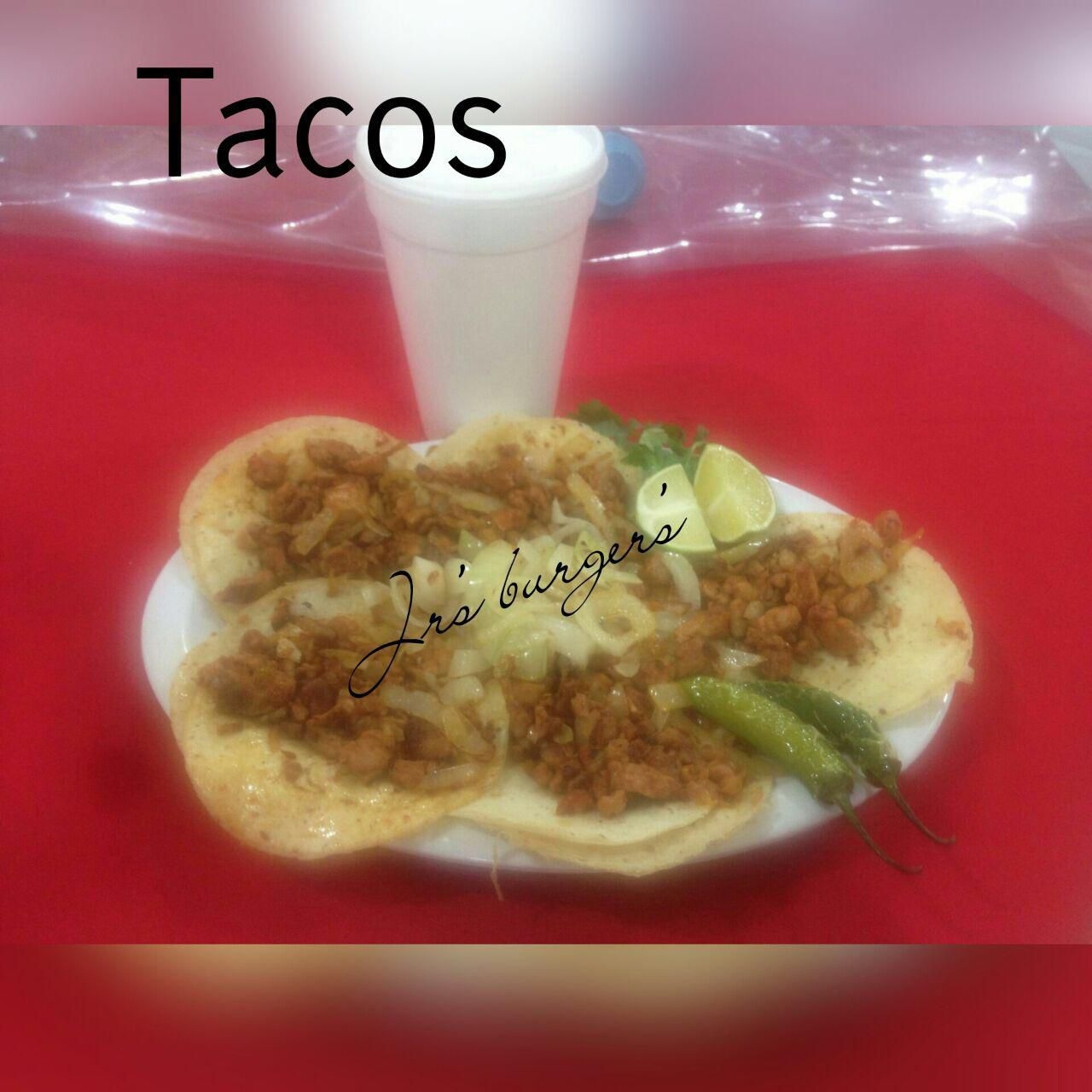 Carne, cebolla, cilantro, cebolla asada,limon,salsa y guacamole