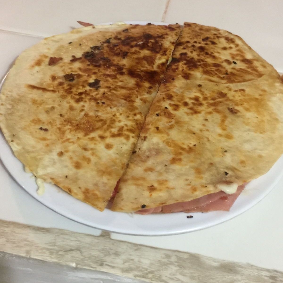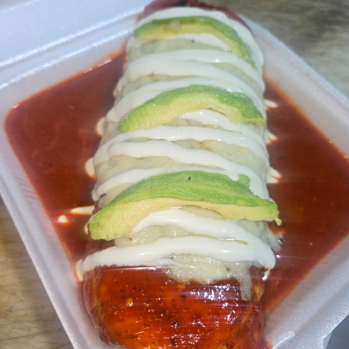 Tortilla de harina de 36cm Por fuera: Mojado en salsa Picosa o No Picosa, queso asadero derretido, aguacate,y crema, Por dentro: Frijol, carne, queso asadero, cebolla, cilantro,salsa picosa y guacamole