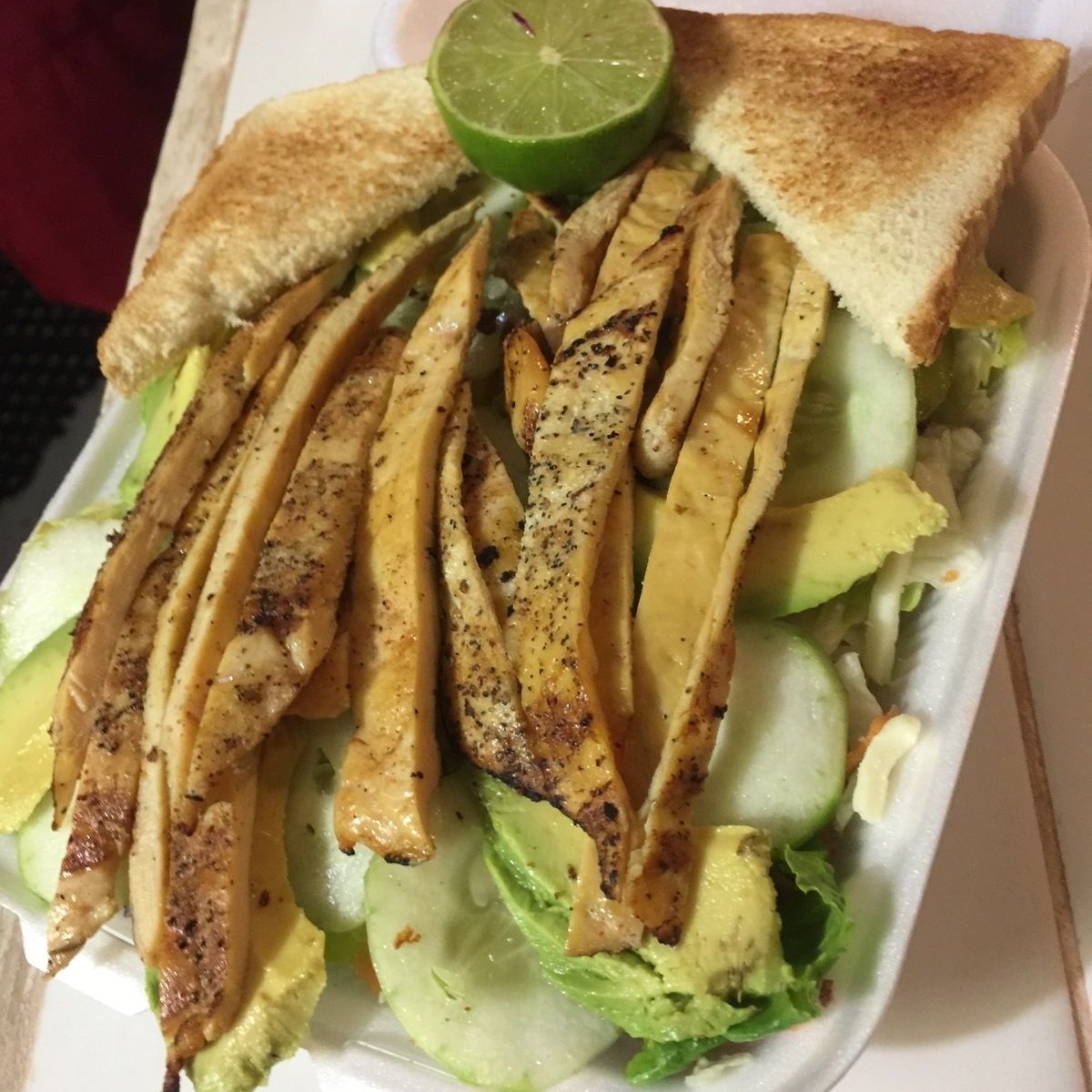 Pollo a la plancha o empanizado mayonesa, cebolla, letchuga, jitomate, aguacate, pepinillos y aderezo especial de la casa