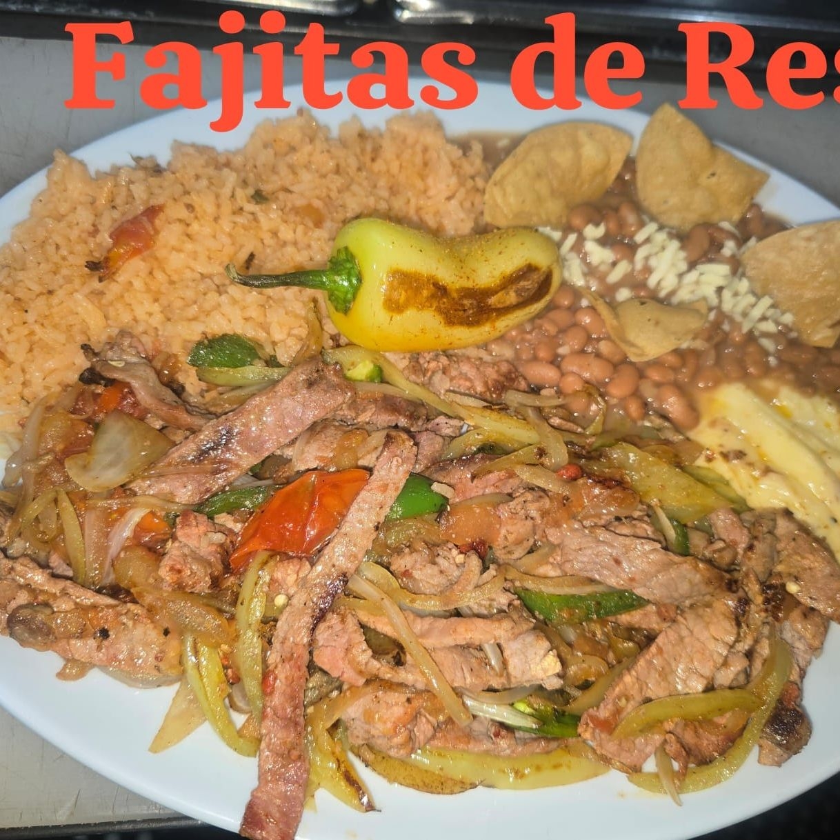 Tiritas de Res guisado con cebolla , jitomate,chile,acompañado de arroz, frijoles y 5 tortillas